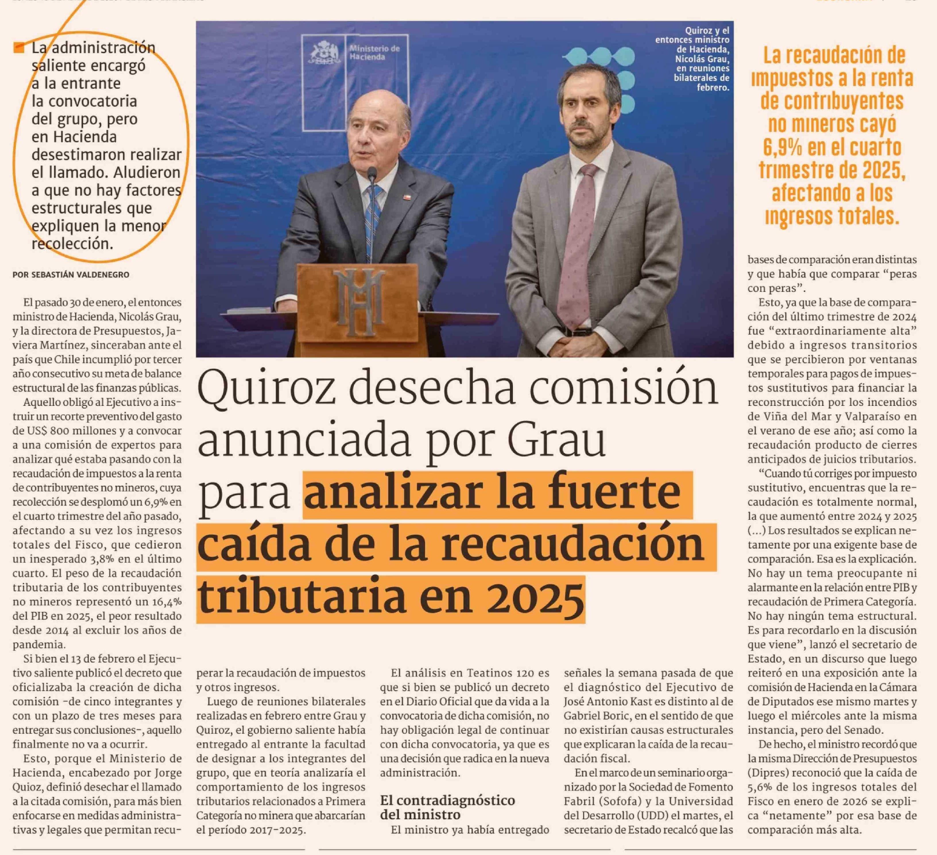 Título: Quiroz desecha comisión anunciada por Grau para analizar la fuerte caída de la recaudación tributaria en 2025
