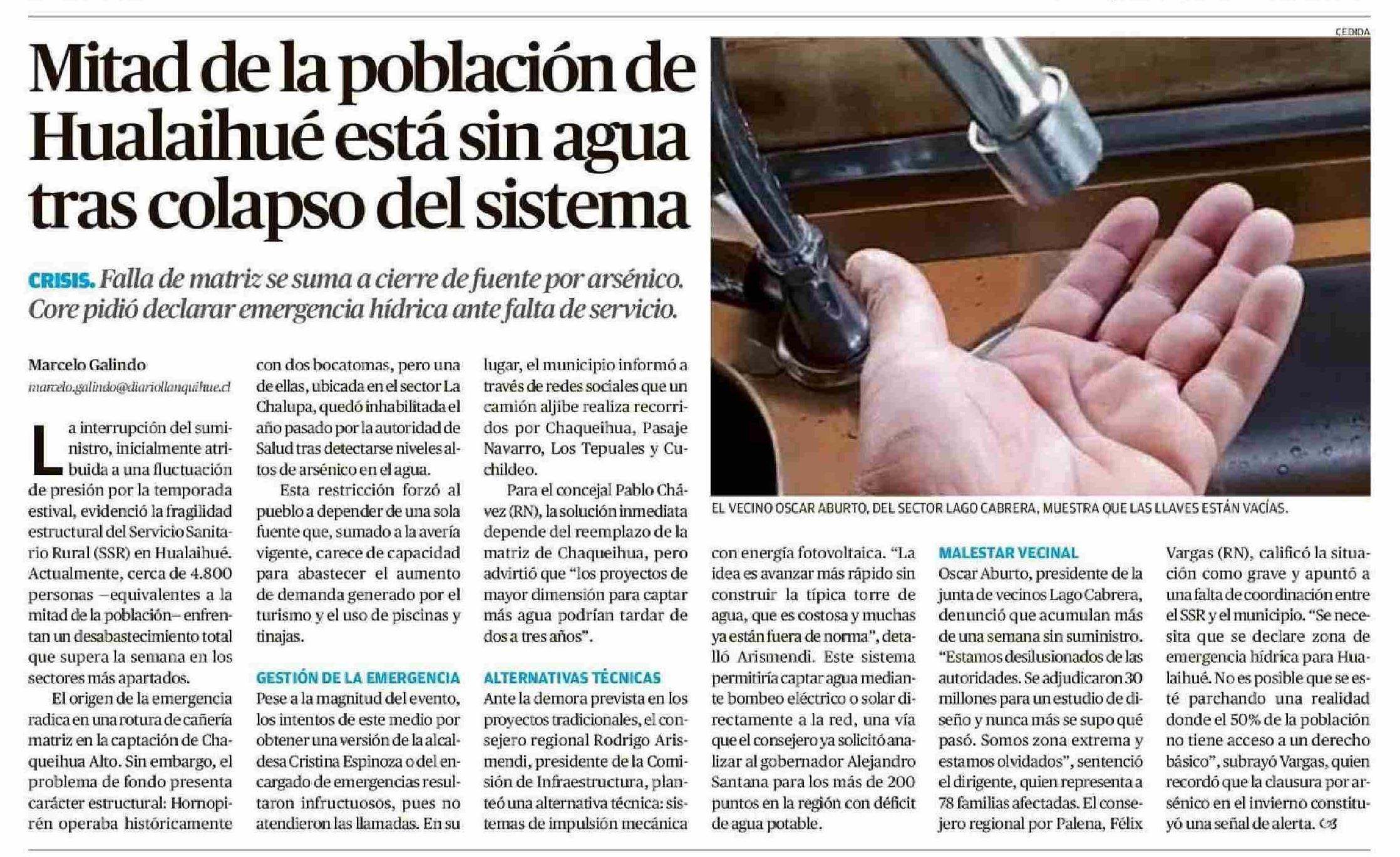 | Título: | Mitad de la población de Hualaihué está sin agua tras colapso del sistema |