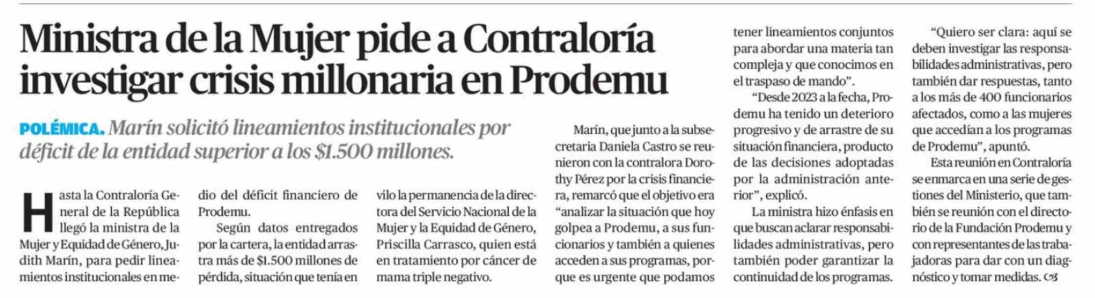 Ministra de la Mujer pide a Contraloría investigar crisis millonaria en Prodemu 03-04-2026 El Mercurio de Calama |