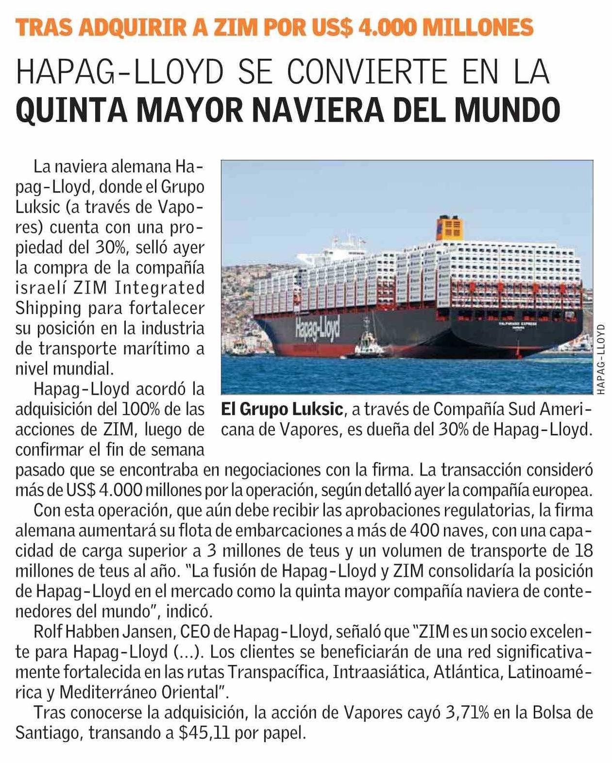 HAPAG-LLOYD SE CONVIERTE EN LA QUINTA MAYOR NAVIERA DEL MUNDO 17-02-2026 El Mercurio |
