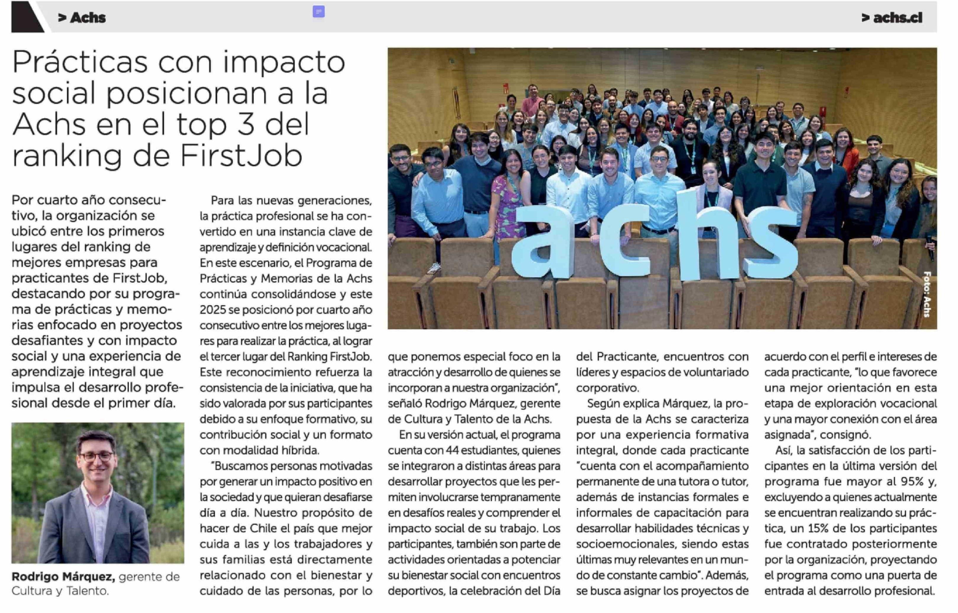 Prácticas con impacto social posicionan a la Achs en el top 3 del ranking de FirstJob 15-02-2026 La Tercera |