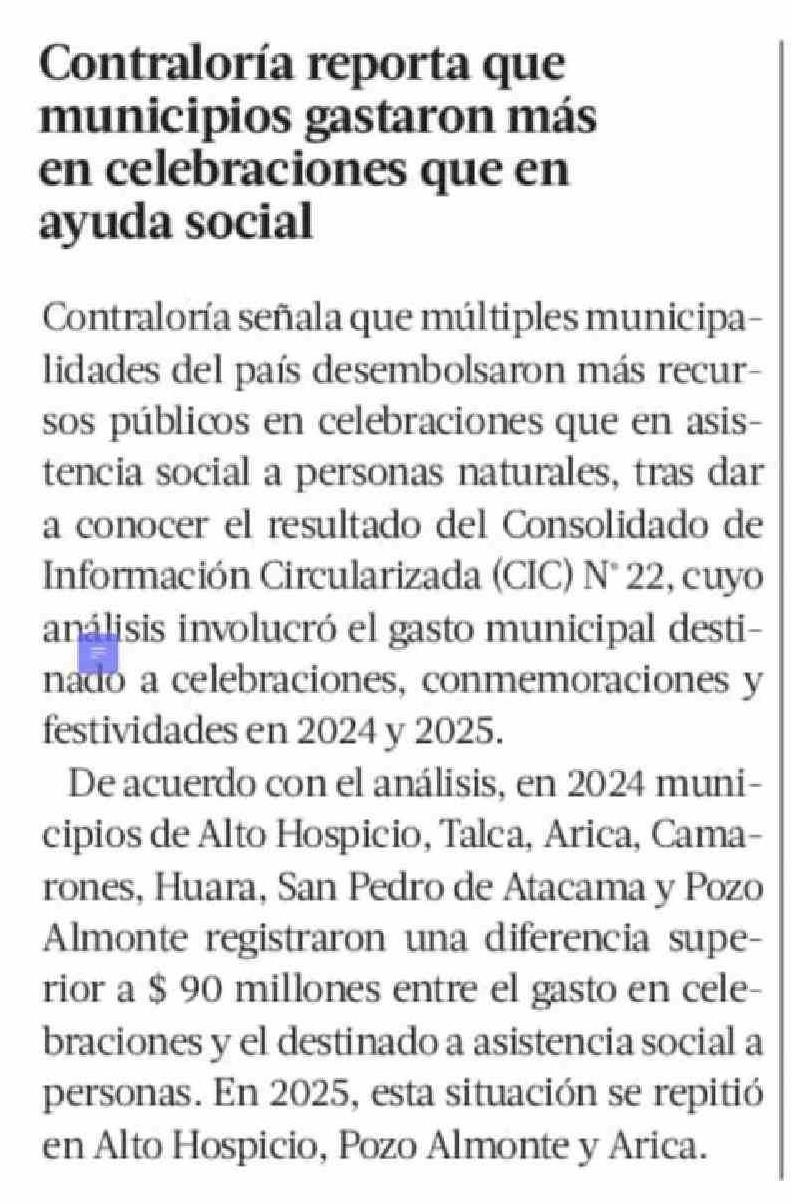 Contraloría reporta que municipios gastaron más en celebraciones que en ayuda social 07-04-2026 La Tercera |