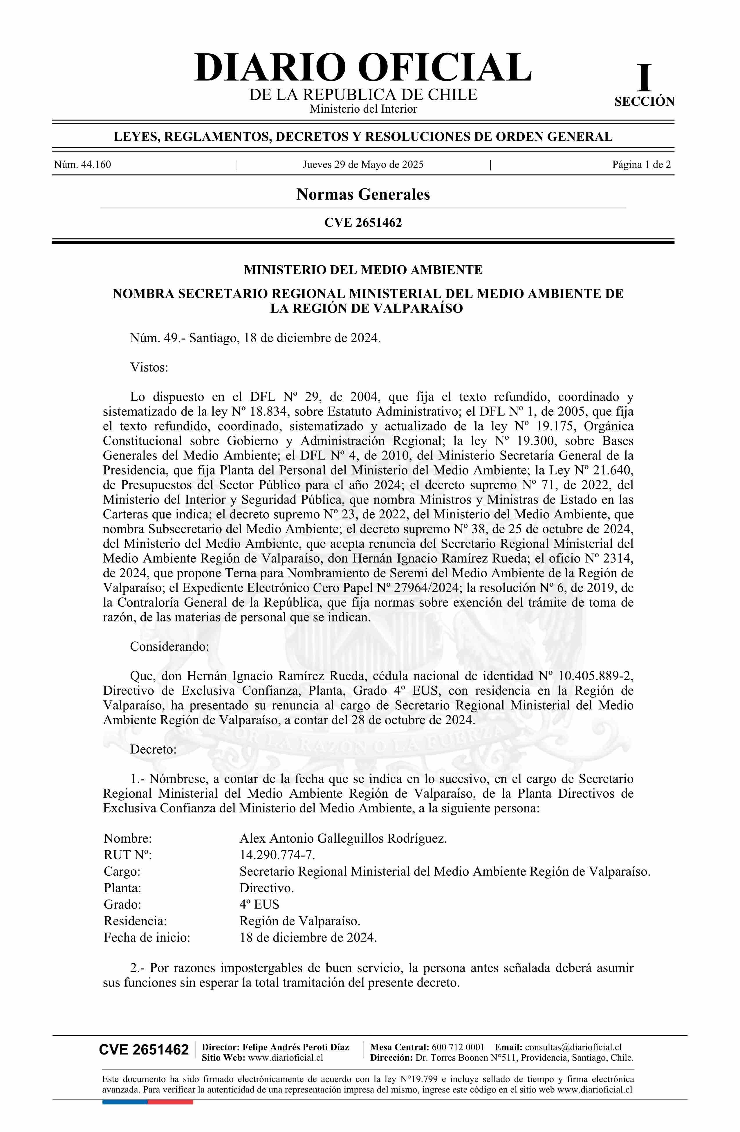 Decreto número 49, de 2024.- Nombra a don Alex Antonio Galleguillos Rodríguez como Secretario Regional Ministerial del Medio Ambiente de la Región de Valparaíso