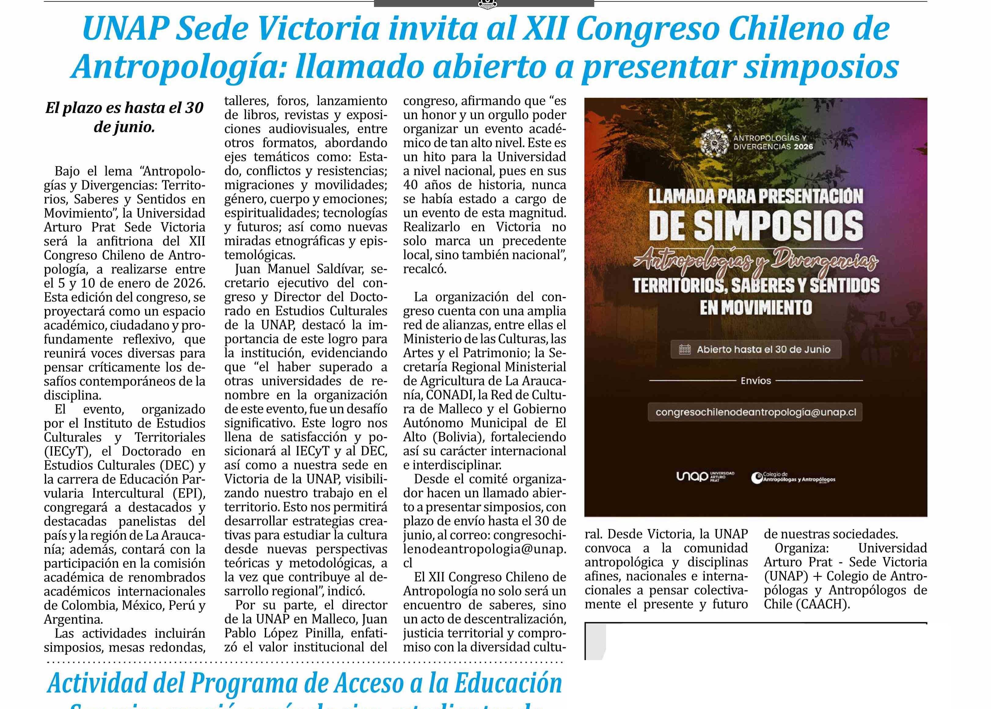 Título: UNAP Sede Victoria invita al XII Congreso Chileno de Antropología: llamado abierto a presentar simposios