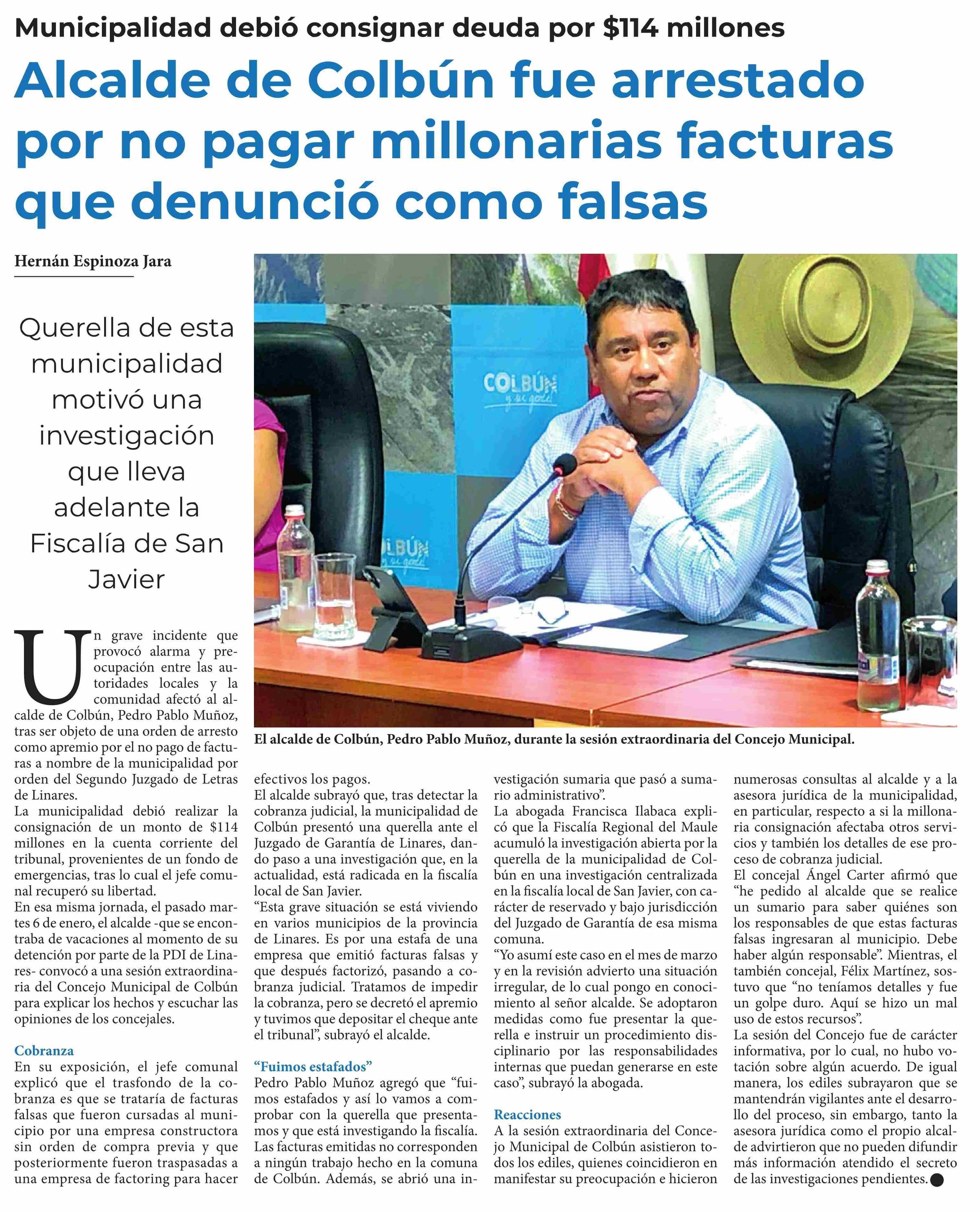 Alcalde de Colbún fue arrestado por no pagar millonarias facturas que denunció como falsas 11-01-2026 Diario Talca |