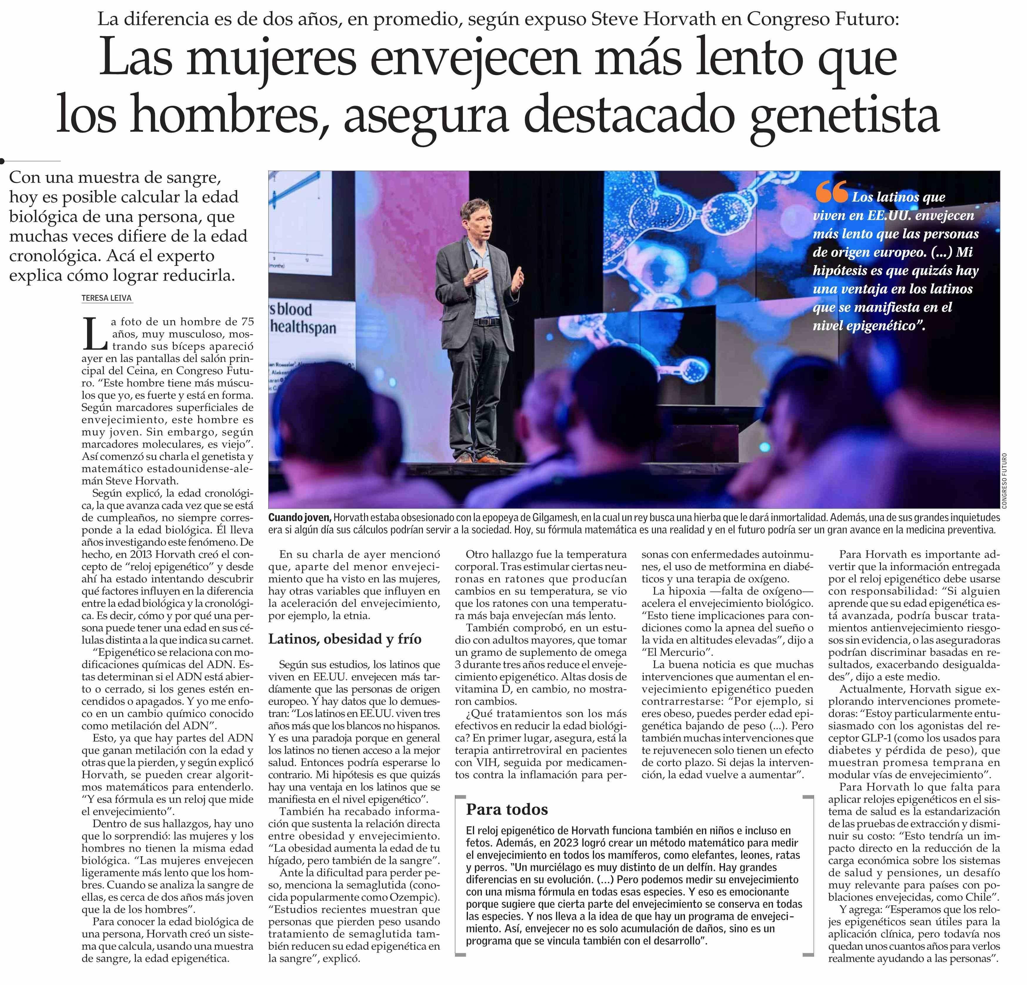 Las mujeres envejecen más lento que los hombres, asegura destacado genetista 15-01-2026 El Mercurio |