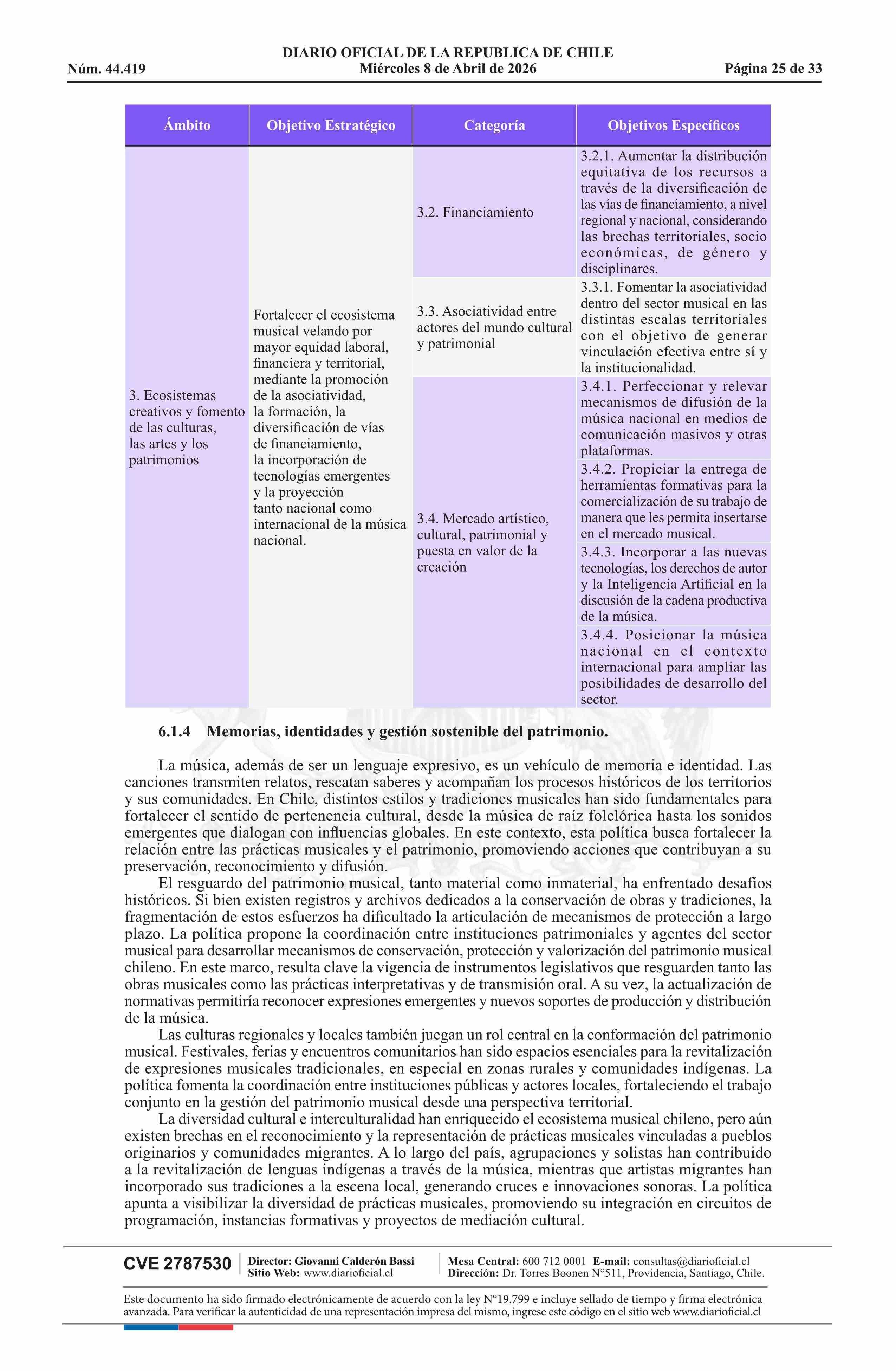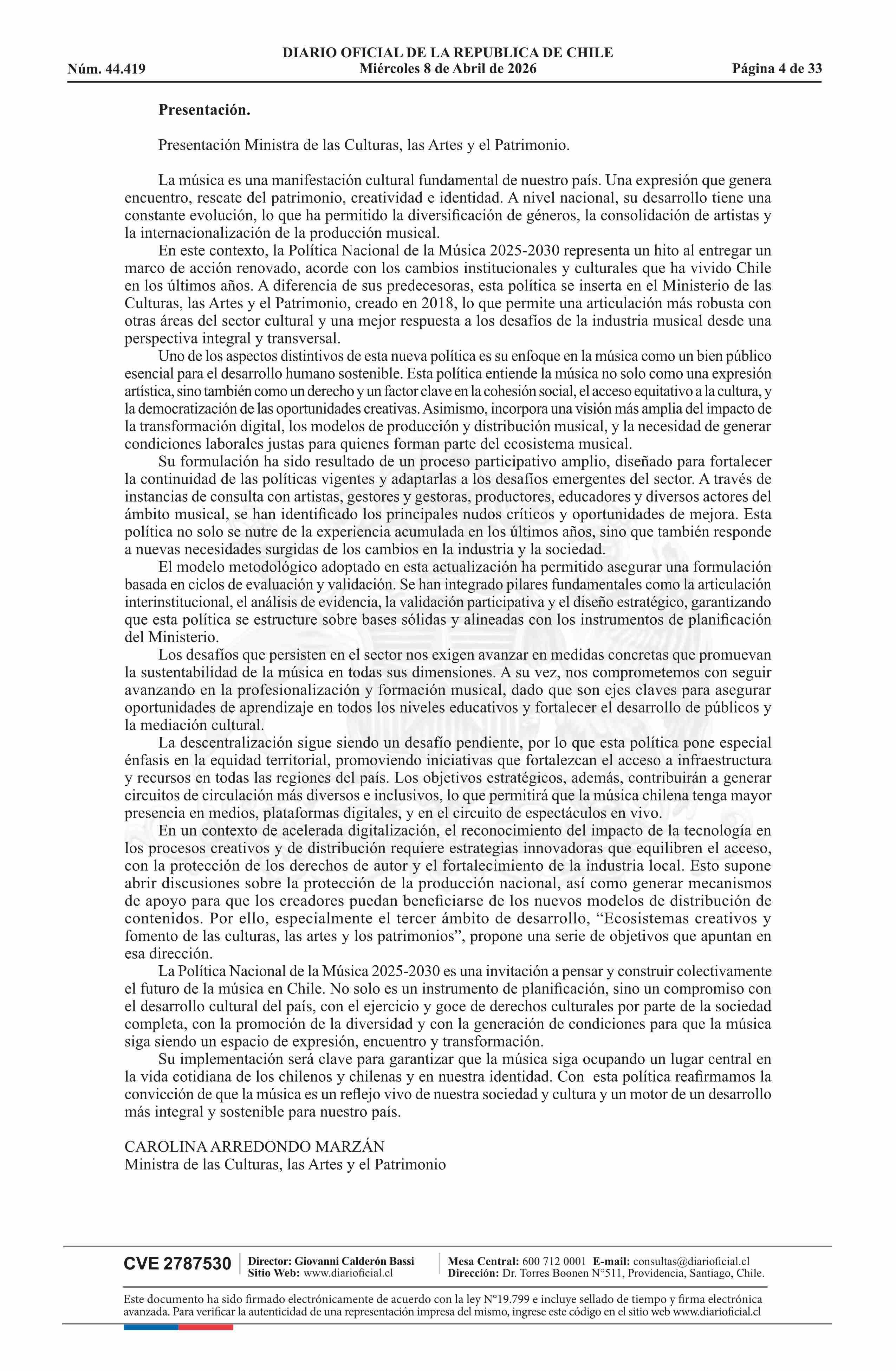 Resolución exenta número 789, de 2026.- Aprueba Política Nacional de Música 2025-2030 08-04-2026 Diario Oficial Edición Electrónica |