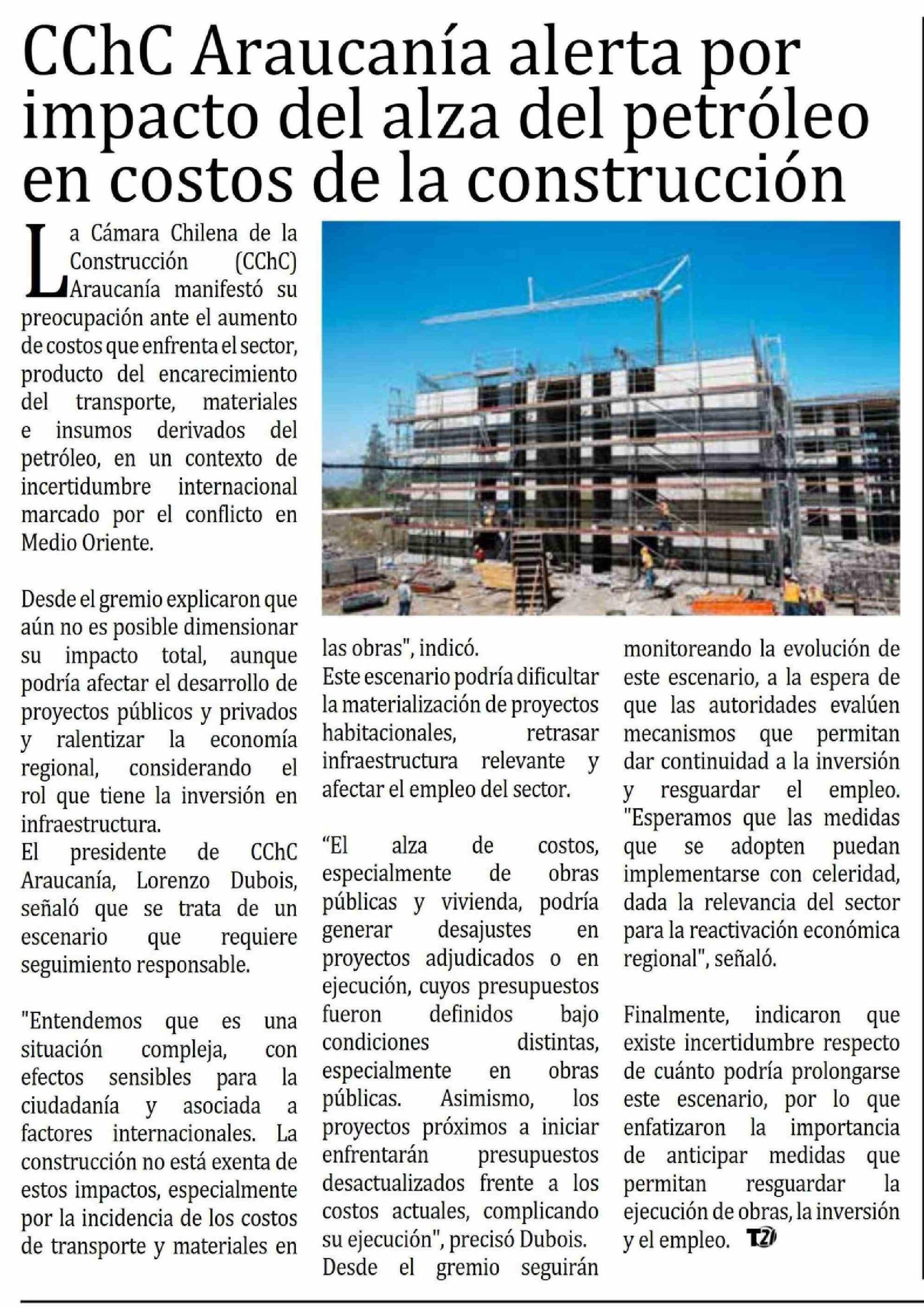 | Título: | CChC Araucanía alerta por impacto del alza del petróleo en costos de la construcción |