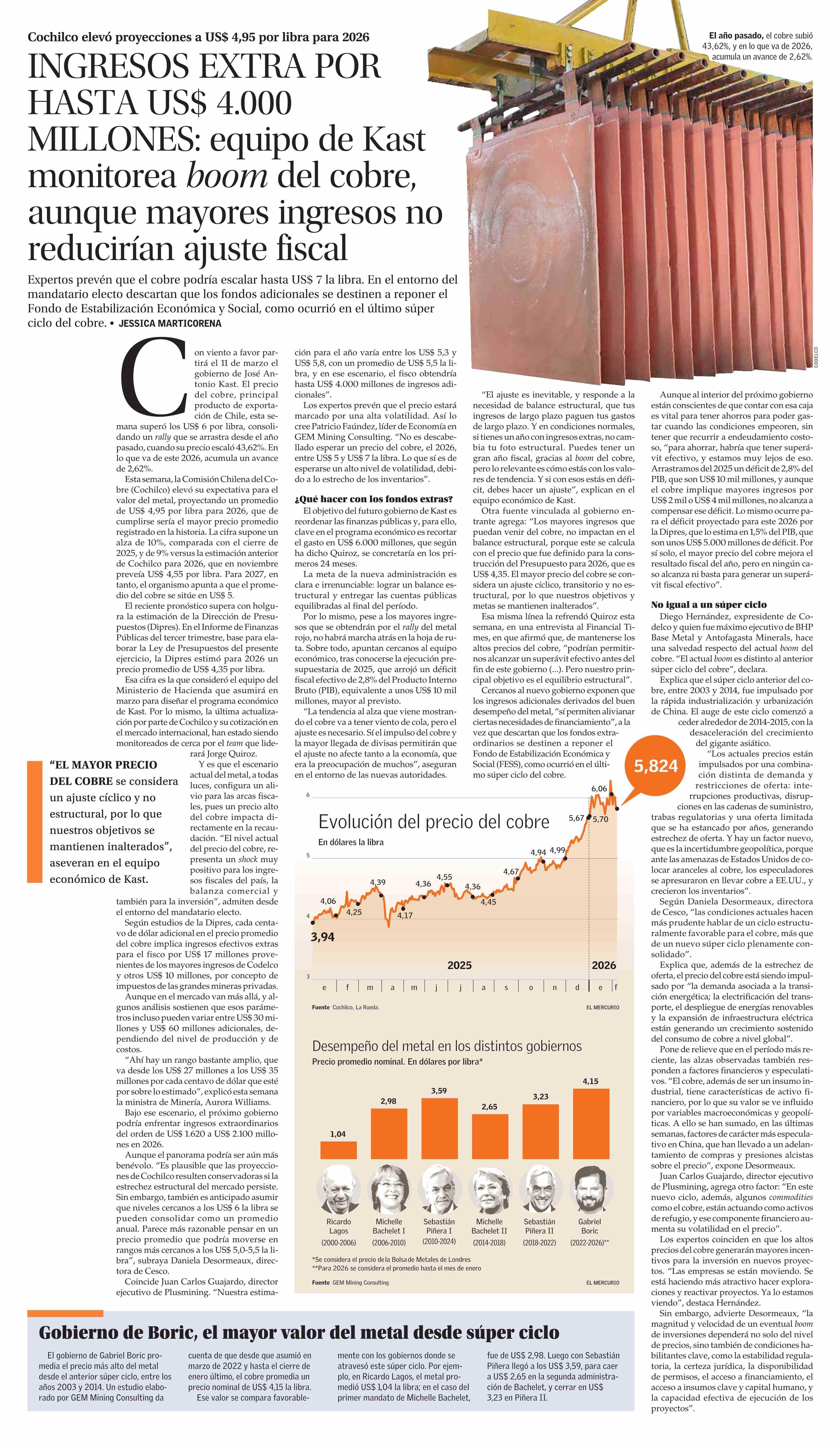 Título: INGRESOS EXTRA POR HASTA US$ 4.000 MILLONES: equipo de Kast monitorea boom del cobre, aunque mayores ingresos no reducirían ajuste fiscal