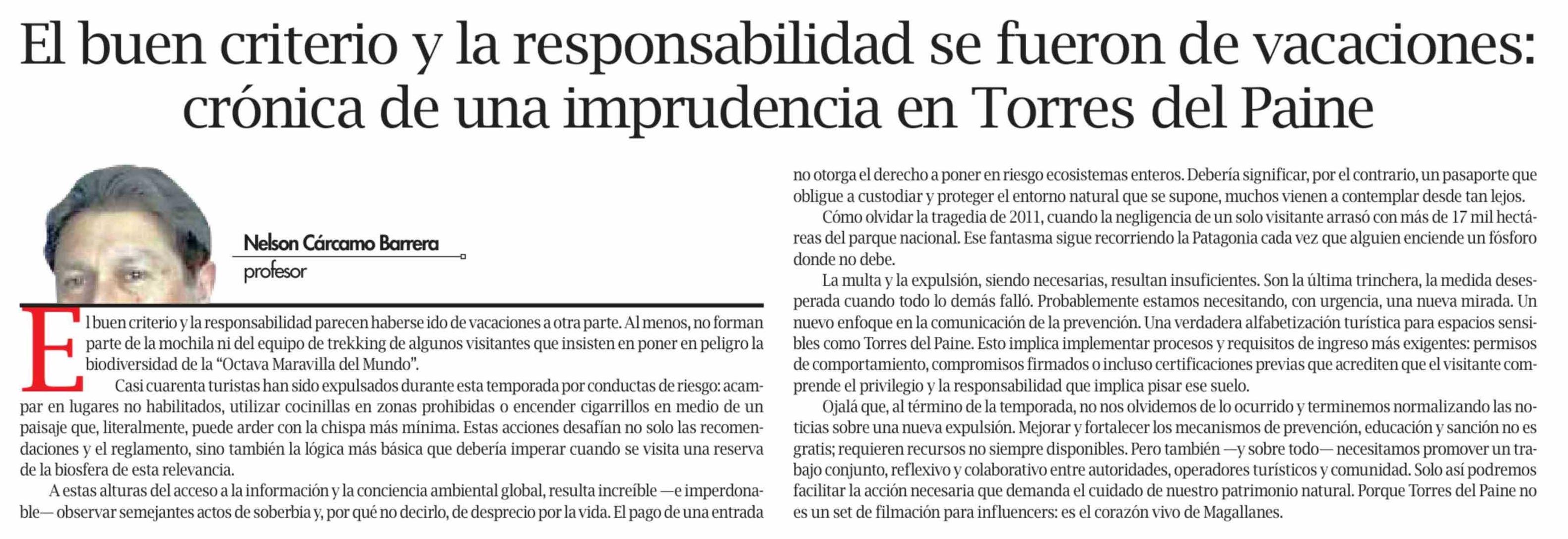 | Título: | Columnas de Opinión: El buen criterio y la responsabilidad se fueron de vacaciones: crónica de una imprudencia en Torres del Paine |