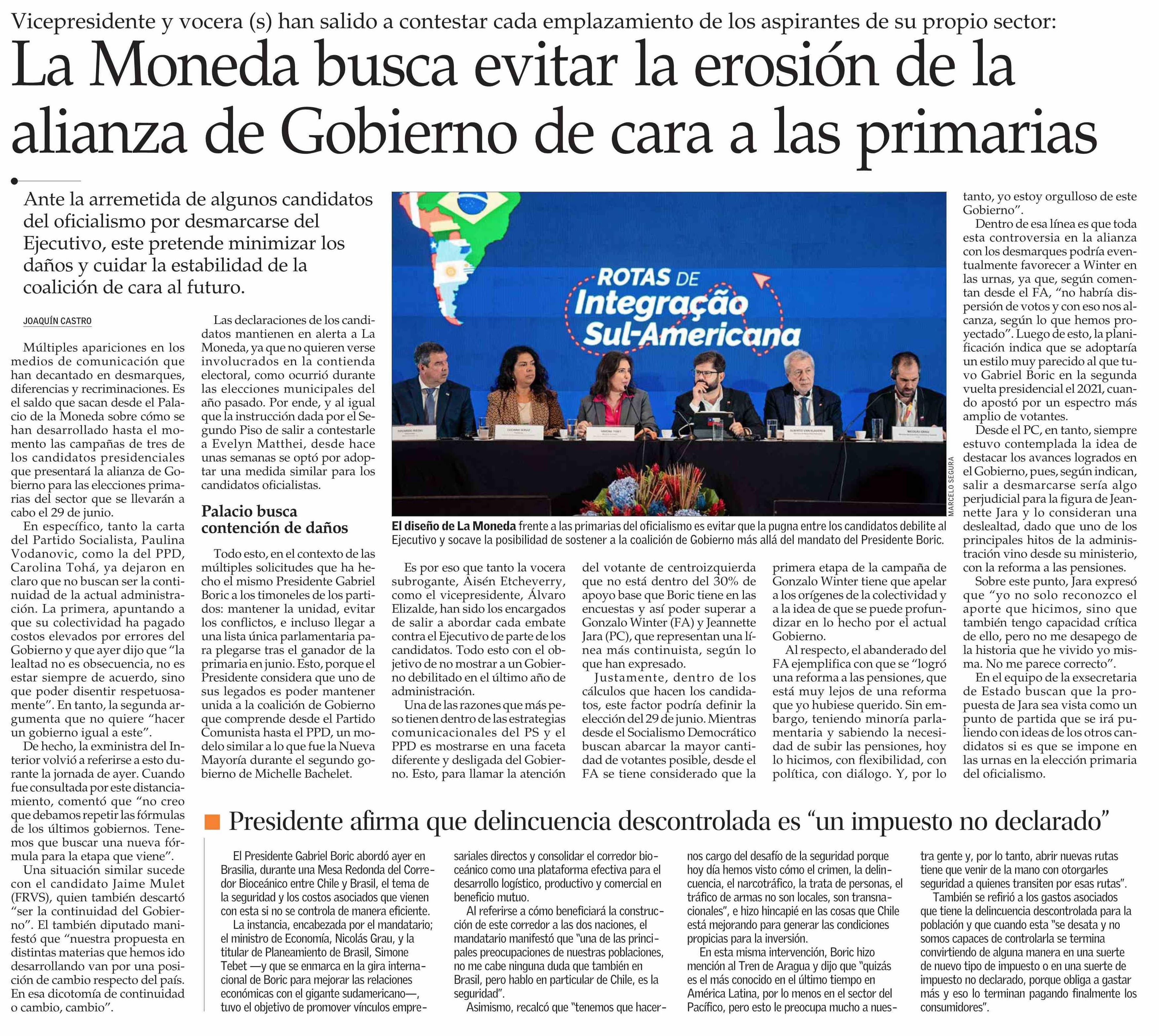 La Moneda busca evitar la erosión de la alianza de Gobierno de cara a las primarias 24-04-2025 El Mercurio |