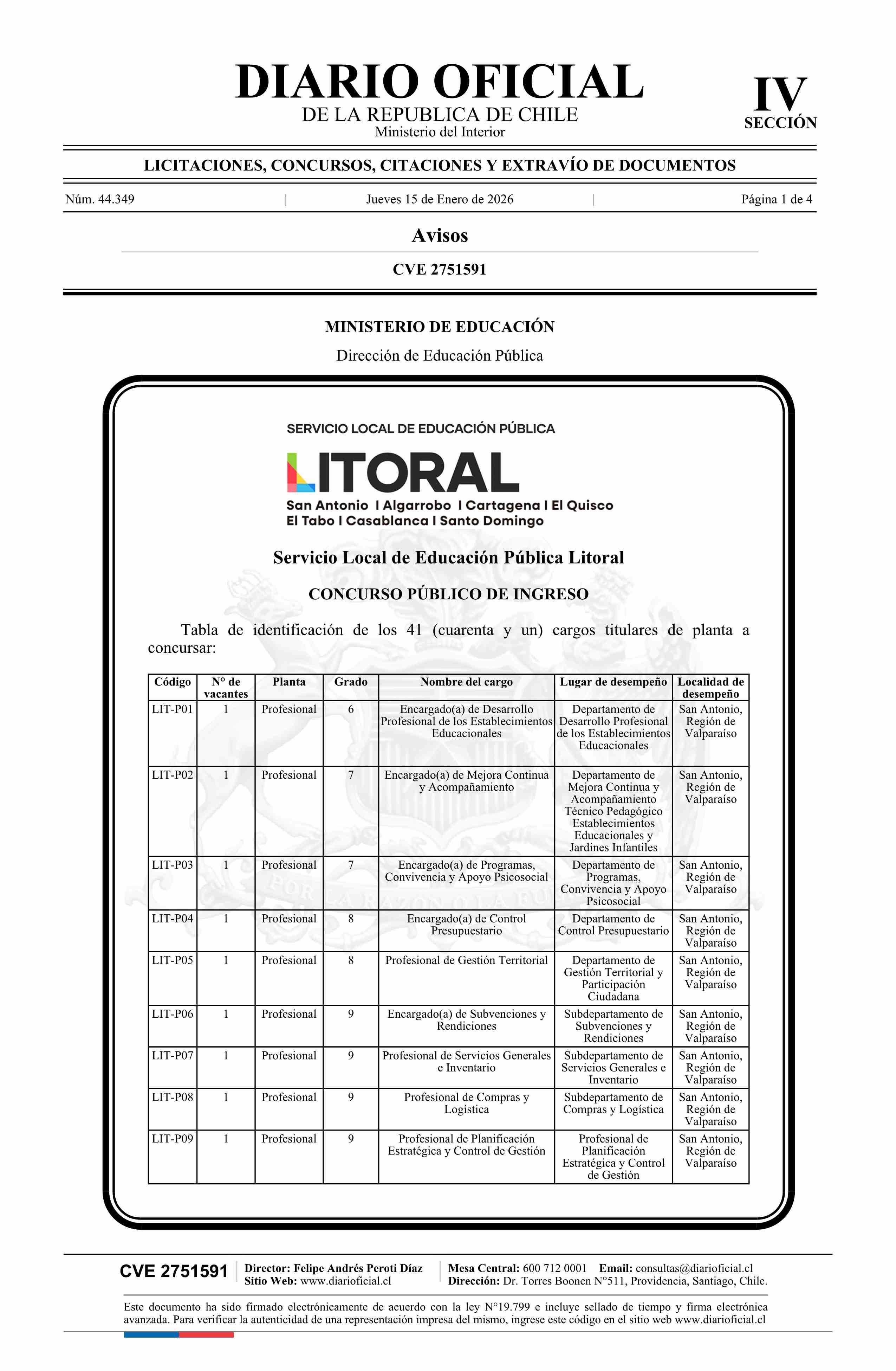 AVISO LICITACIONES: Servicio Local de Educación Pública Litoral llama a concurso público para cargos que indica 15-01-2026 Diario Oficial Edición Electrónica |