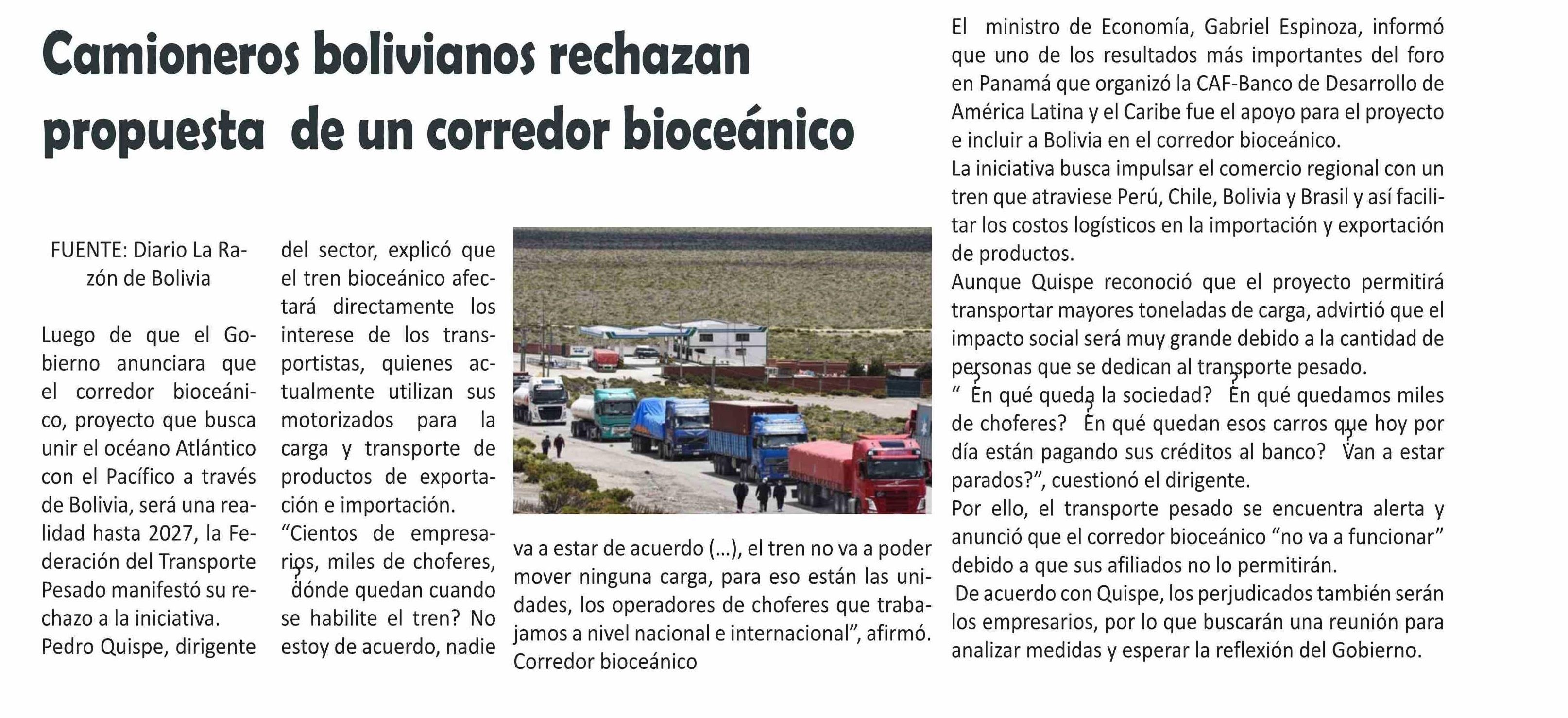 | Título: | Camioneros bolivianos rechazan propuesta de un corredor bioceánico |
