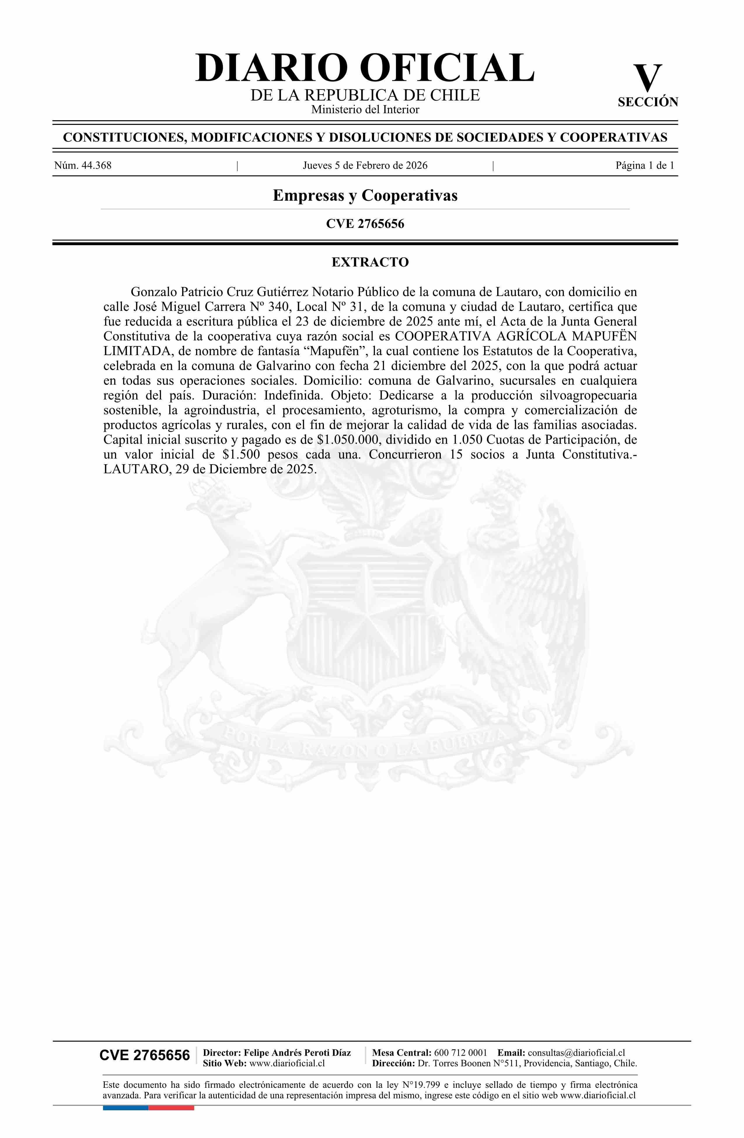 COOPERATIVA AGRÍCOLA MAPUFËN LIMITADA 05-02-2026 Diario Oficial Edición Electrónica |