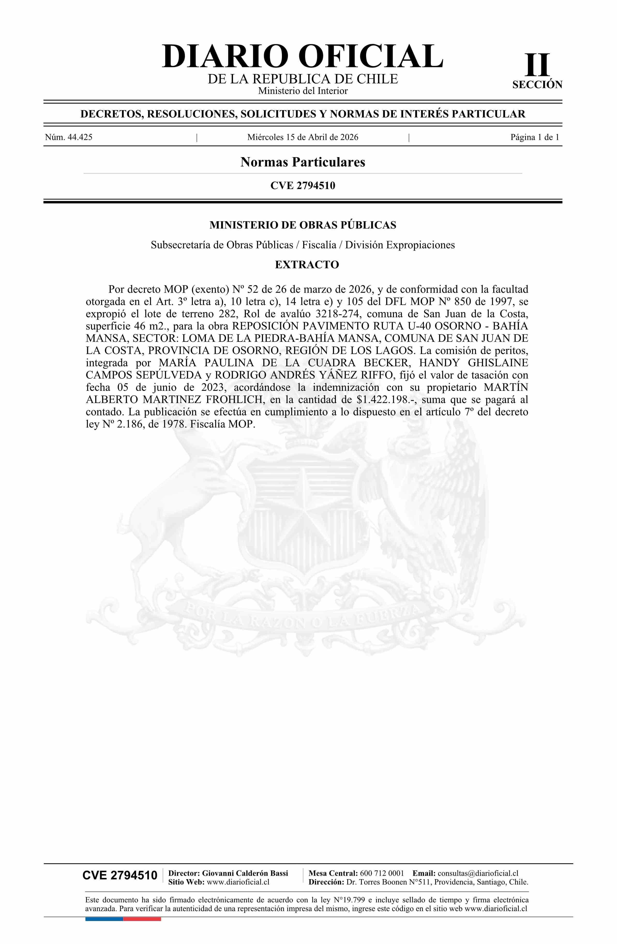 Fuente: Diario Oficial Edición Electrónica (Diario Oficial de Chile - 2 Normas Particulares) Página(s): 98
