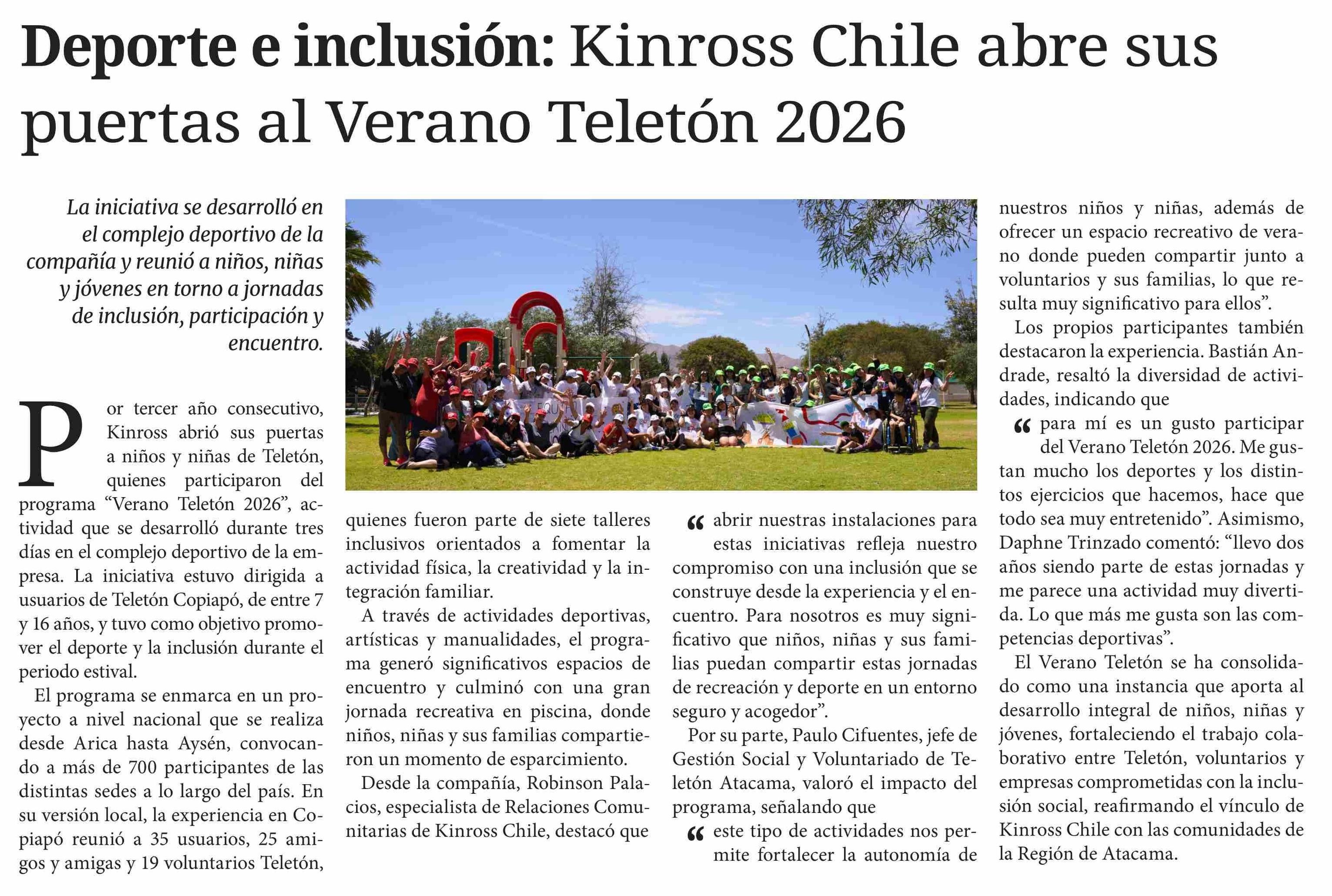 | Título: | Deporte e inclusión: Kinross Chile abre sus puertas al Verano Teletón 2026 |