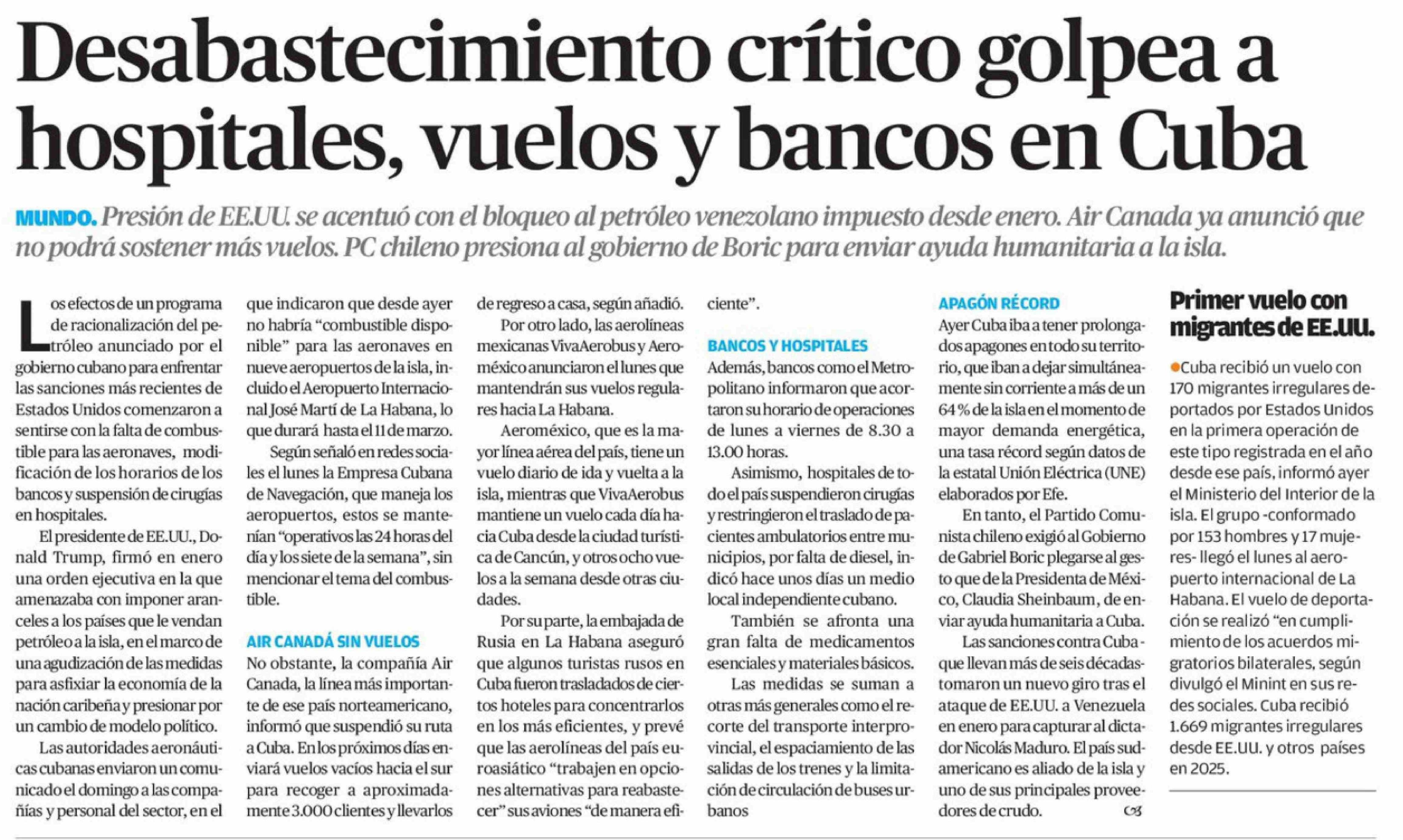 Desabastecimiento crítico golpea a hospitales, vuelos y bancos en Cuba 11-02-2026 El Mercurio de Calama |
