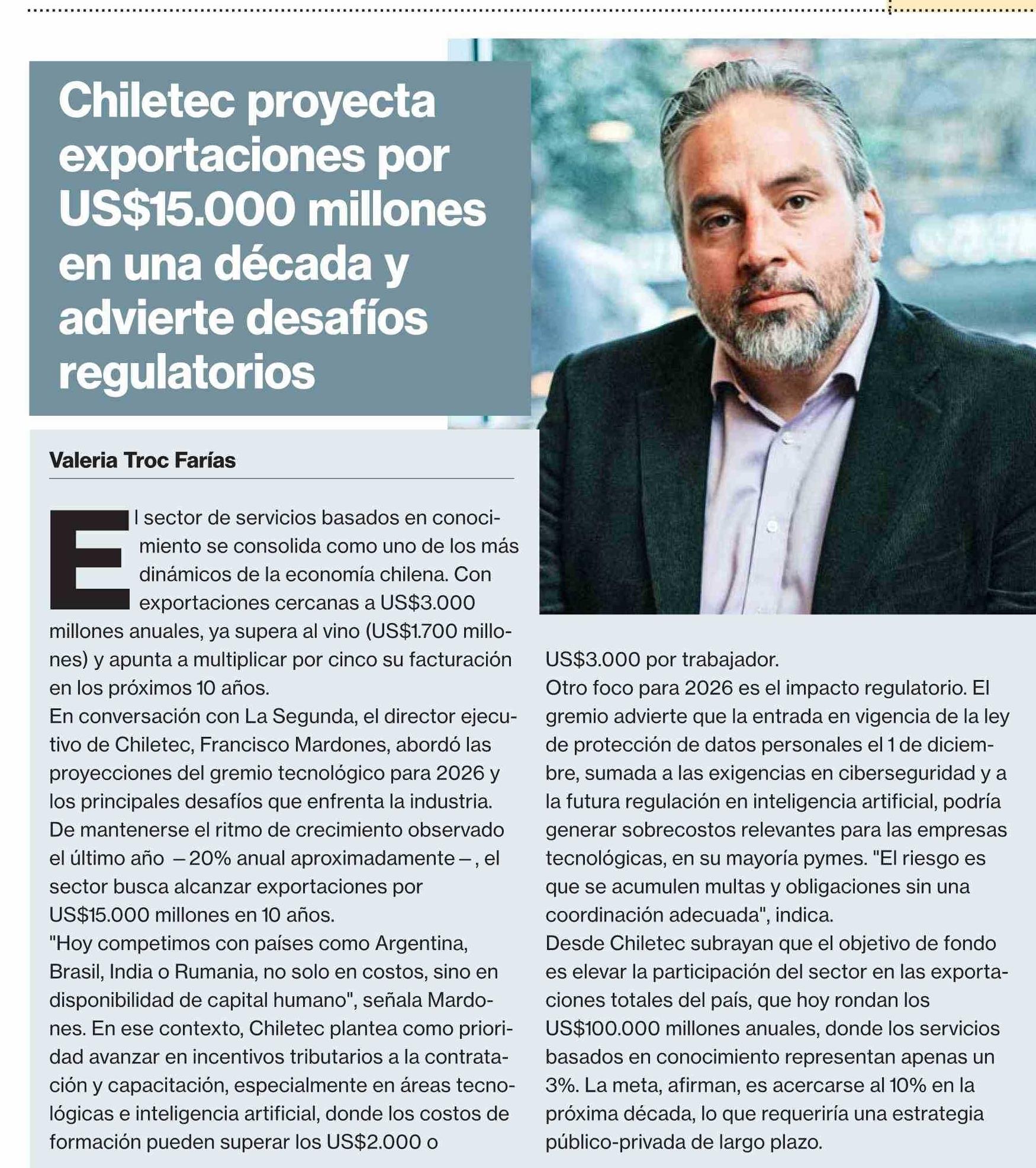 Chiletec proyecta exportaciones por US$15.000 millones en una década y advierte desafíos regulatorios 06-02-2026 La Segunda |