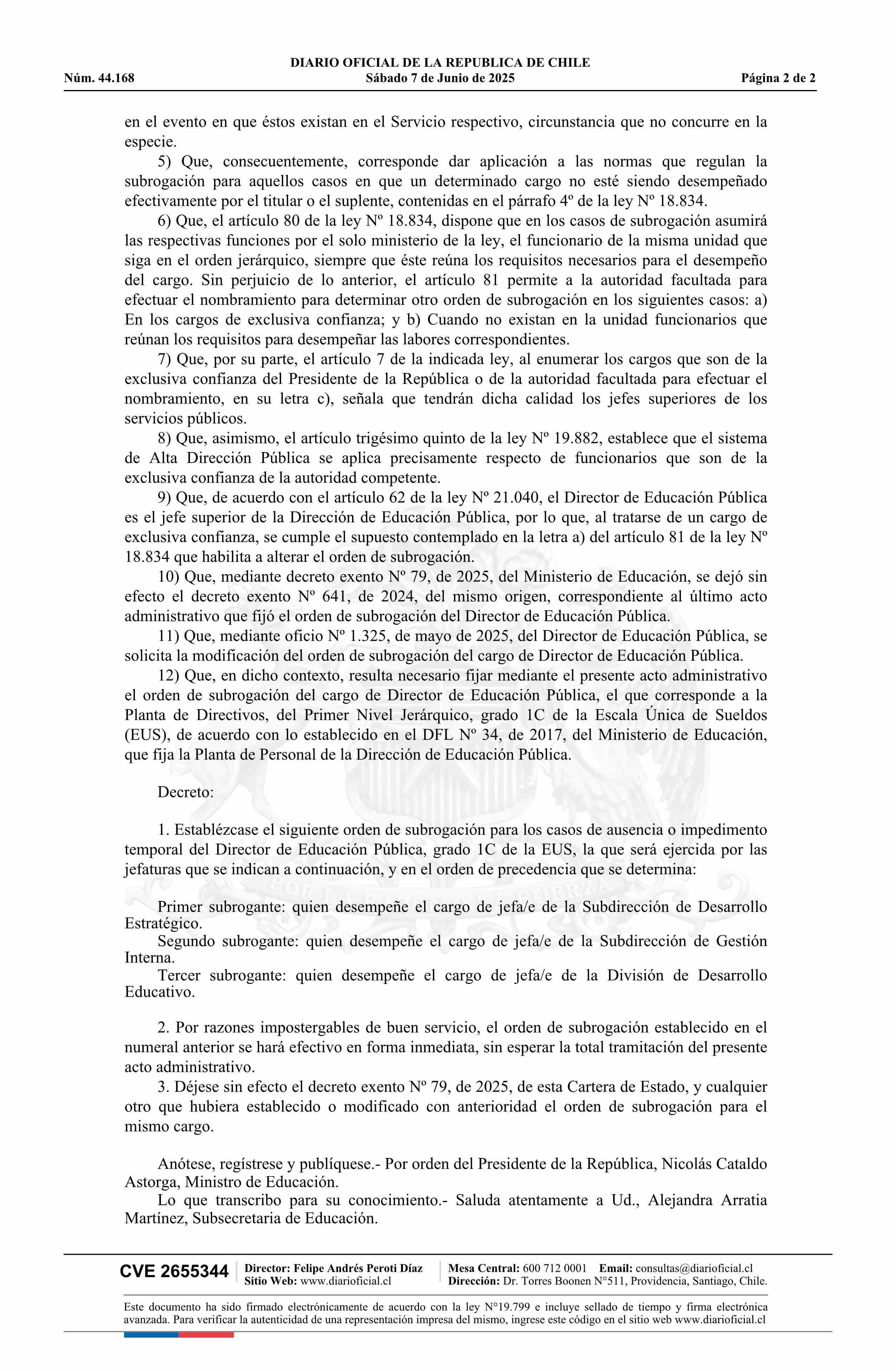 Decreto exento número 394, de 2025.- Establece nuevo orden de subrogación para el cargo de Director de Educación Pública y deja sin efecto decreto Nº 79 exento, de 2025 07-06-2025 DIARIO OFICIAL CHILE - BOLETÍN OFICIAL DE MINERÍA |