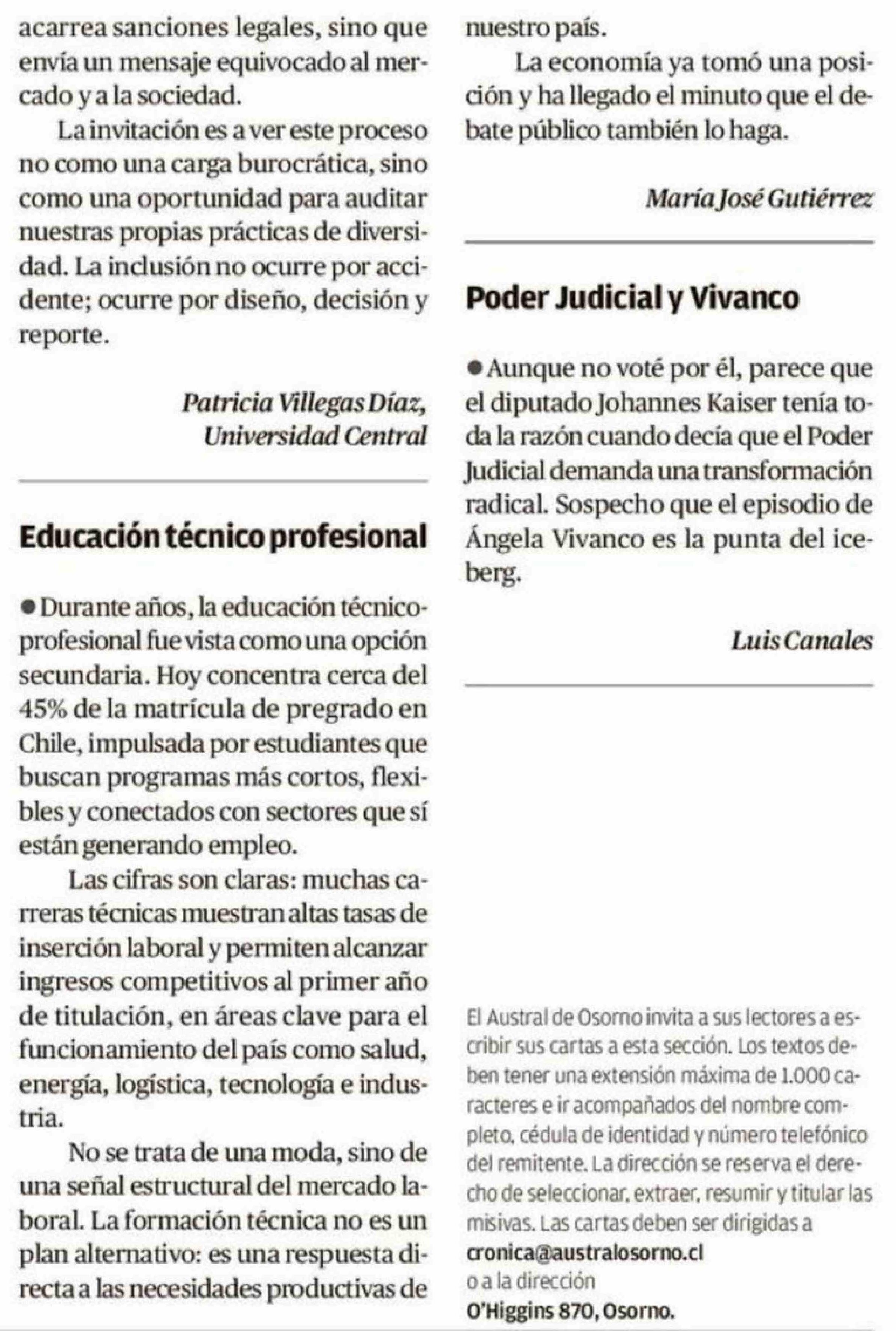 Cartas: Educación técnico profesional 02-02-2026 El Austral de Osorno |
