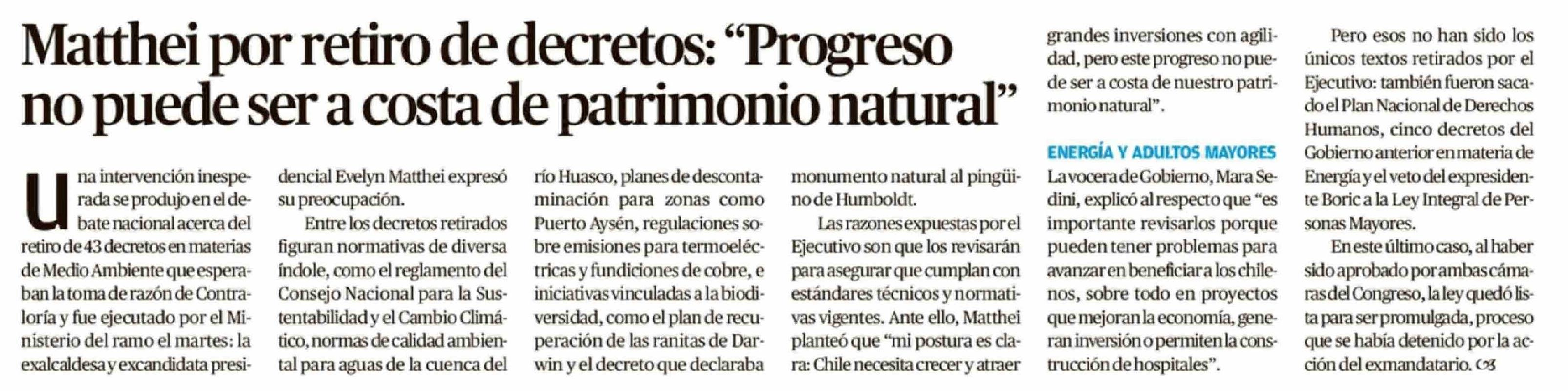 | Título: | Matthei por retiro de decretos: "Progreso no puede ser a costa de patrimonio natural" |