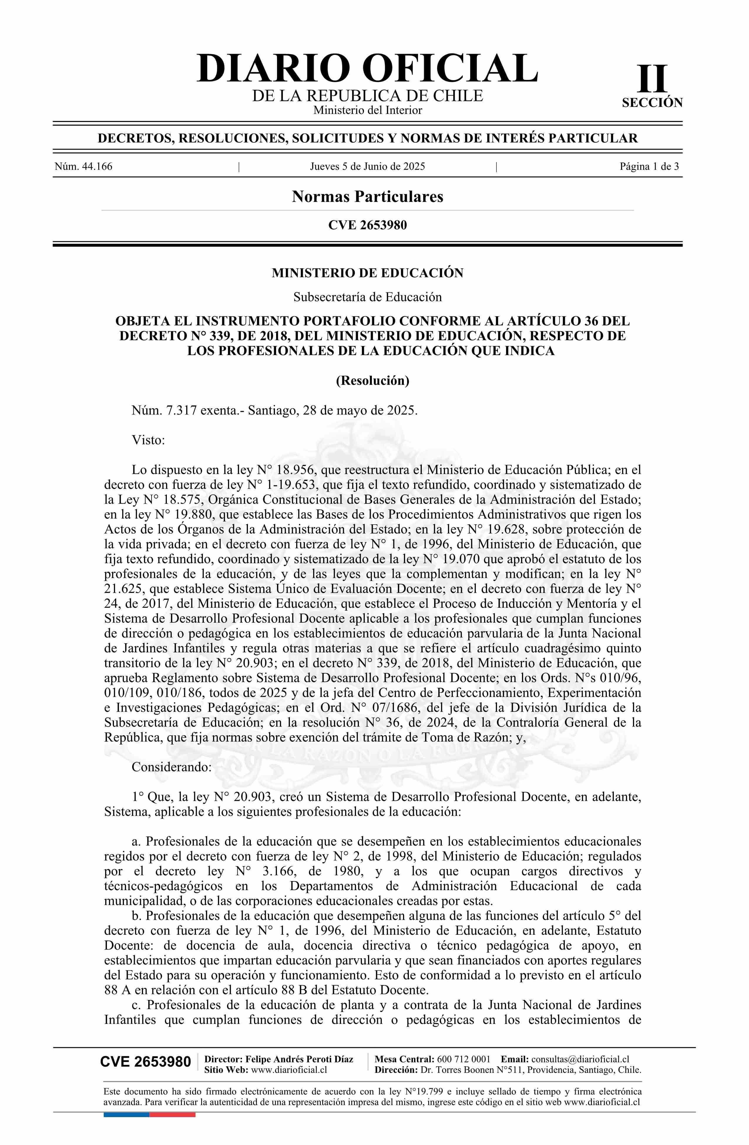 | Título: | Resolución exenta número 7.317, de 2025.- Objeta el instrumento portafolio conforme al artículo 36 del decreto N° 339, de 2018, respecto de los profesionales de la educación que indica |