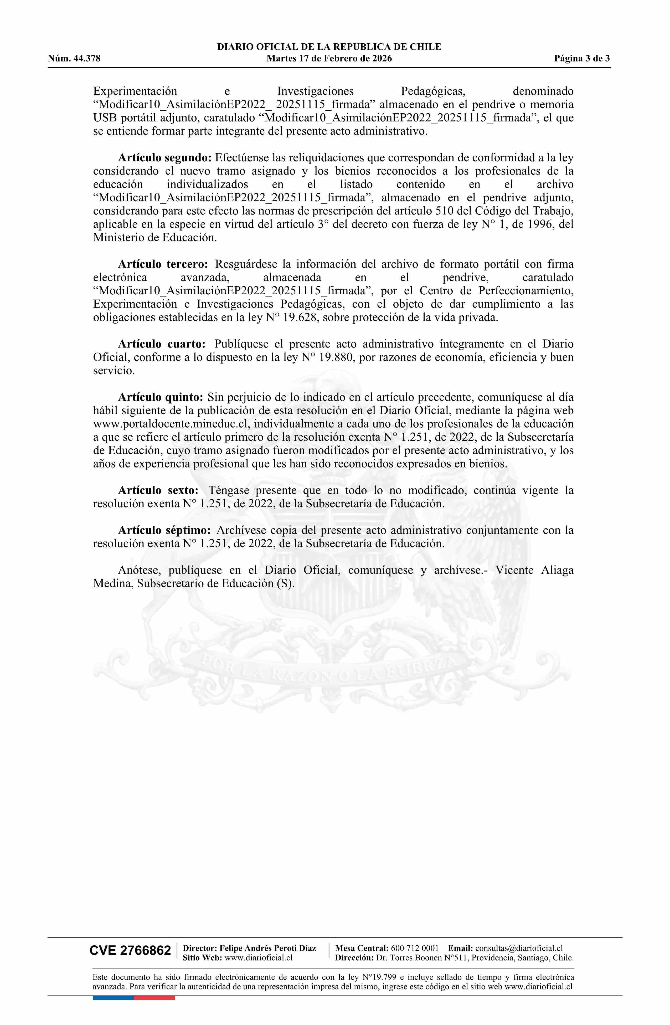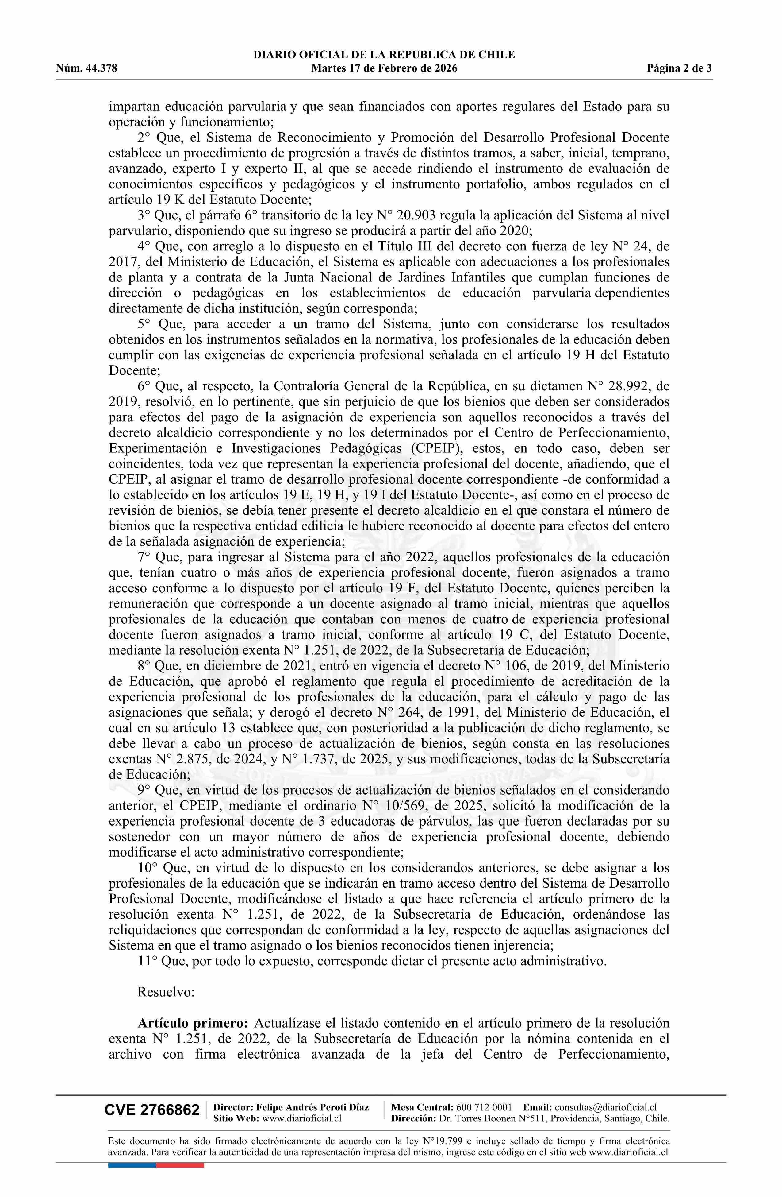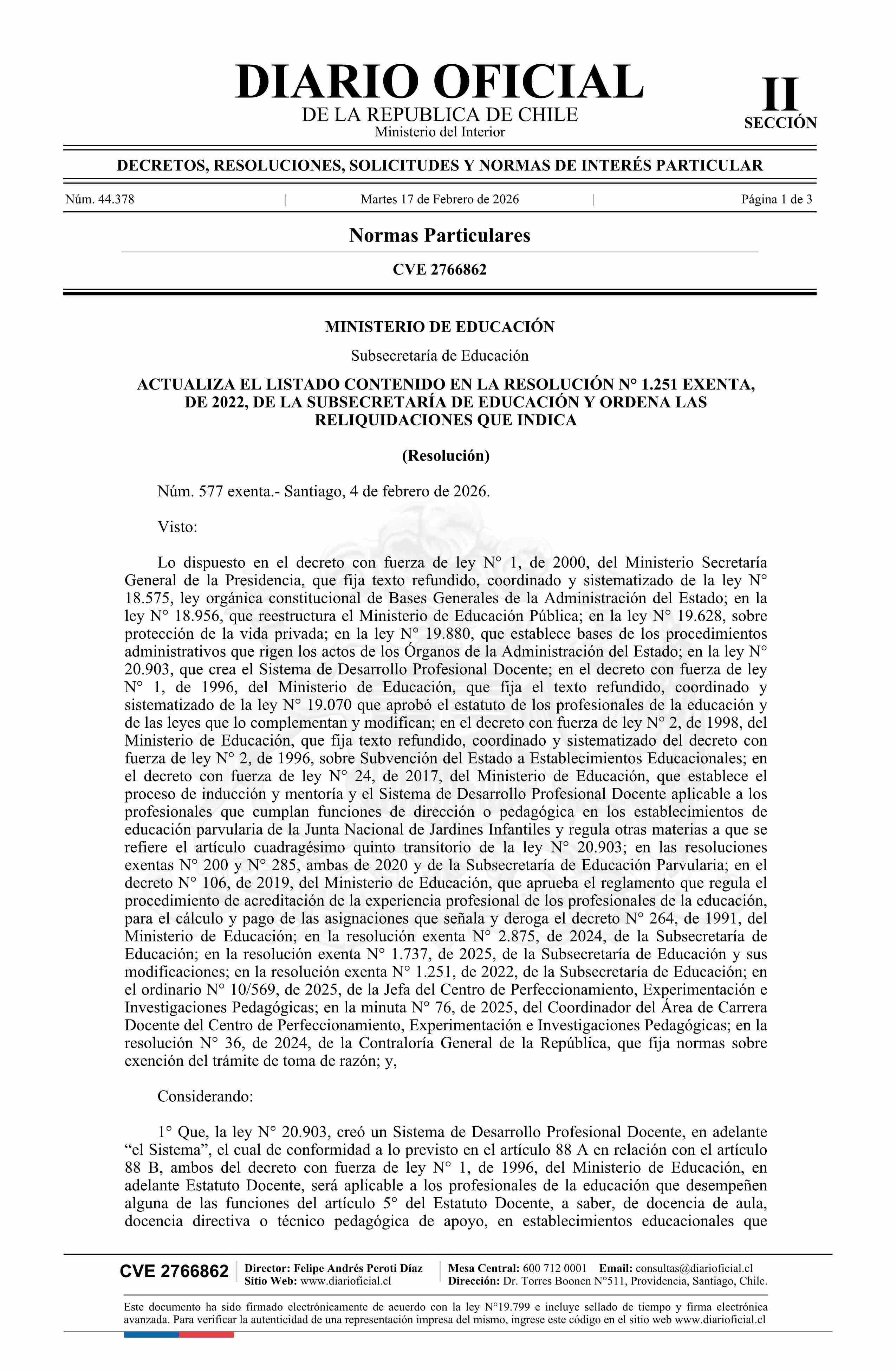 Resolución exenta número 577, de 2026.- Actualiza el listado contenido en la resolución N° 1.251 exenta, de 2022, y ordena las reliquidaciones que indica 17-02-2026 Diario Oficial Edición Electrónica |