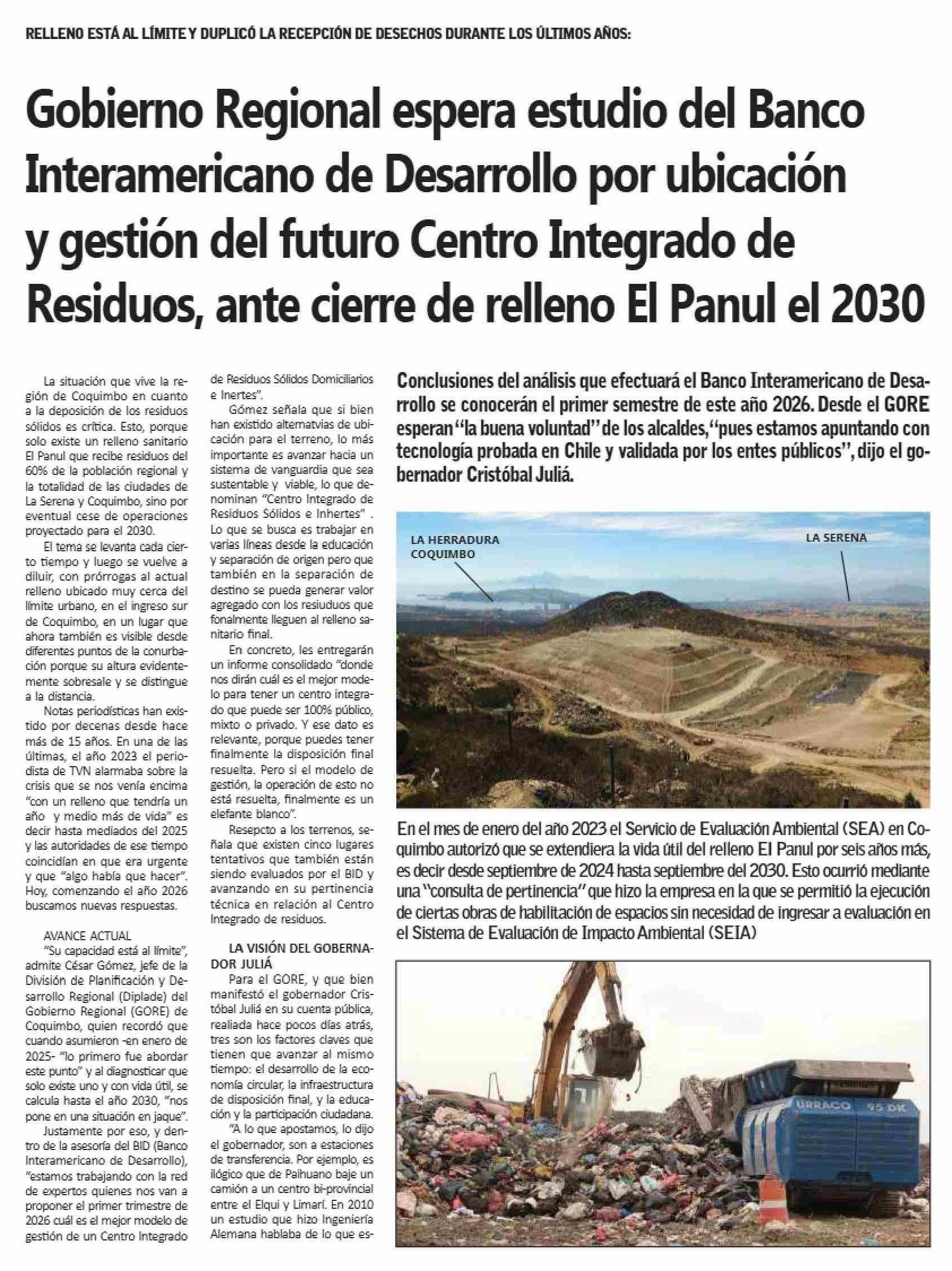 | Título: | Gobierno Regional espera estudio del Banco Interamericano de Desarrollo por ubicación y gestión del futuro Centro Integrado de Residuos, ante cierre de relleno El Panul el 2030 |