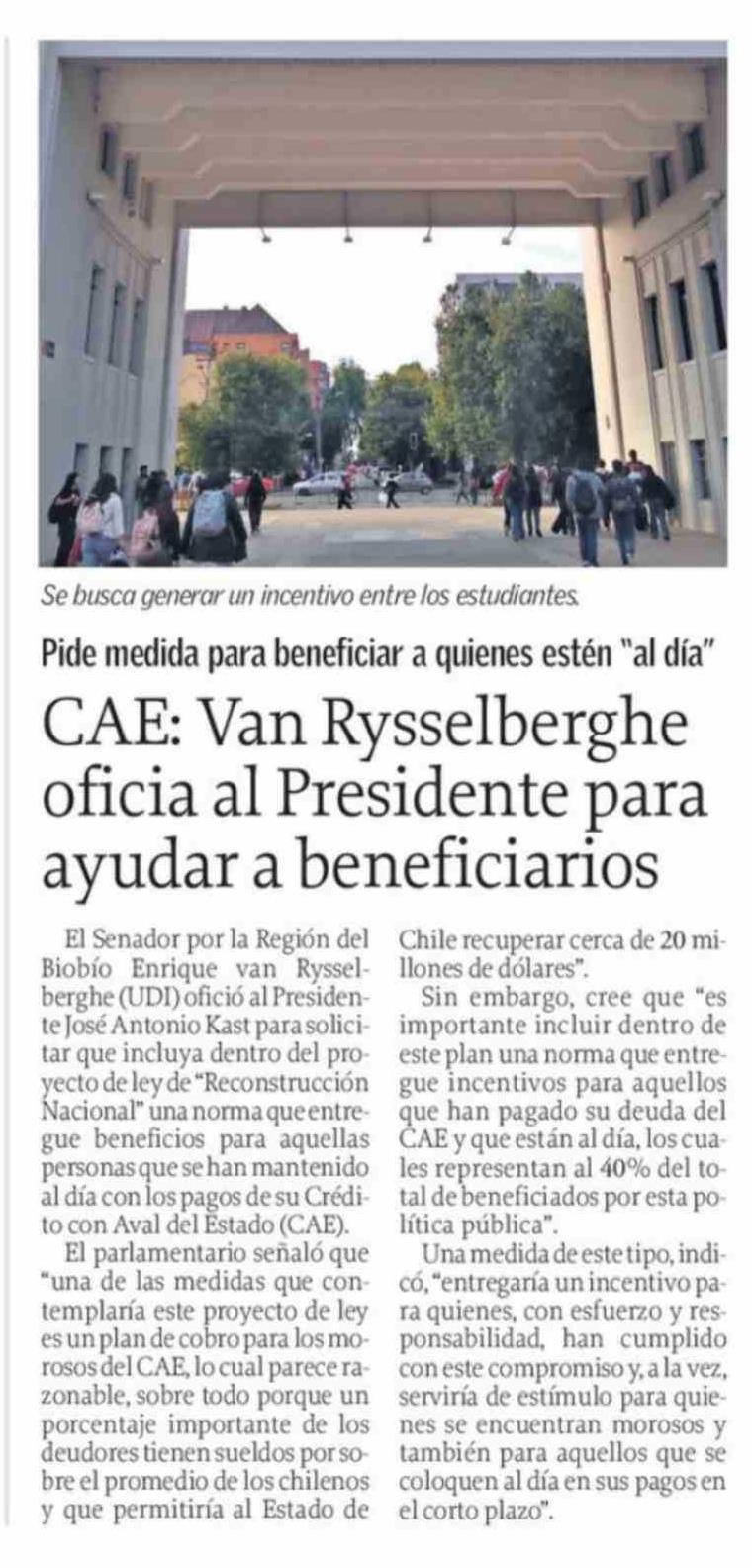 CAE: Van Rysselberghe oficia al Presidente para ayudar a beneficiarios 23-03-2026 El Sur |