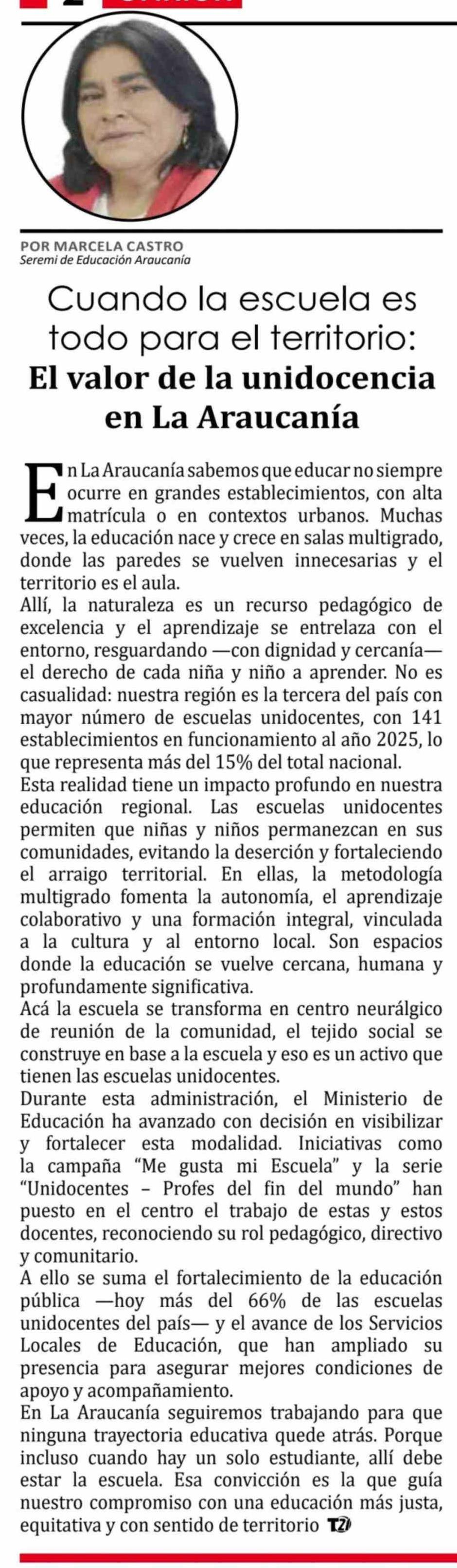 | Título: | Columnas de Opinión: Cuando la escuela es todo para el territorio: El valor de la unidocencia en La Araucanía |
