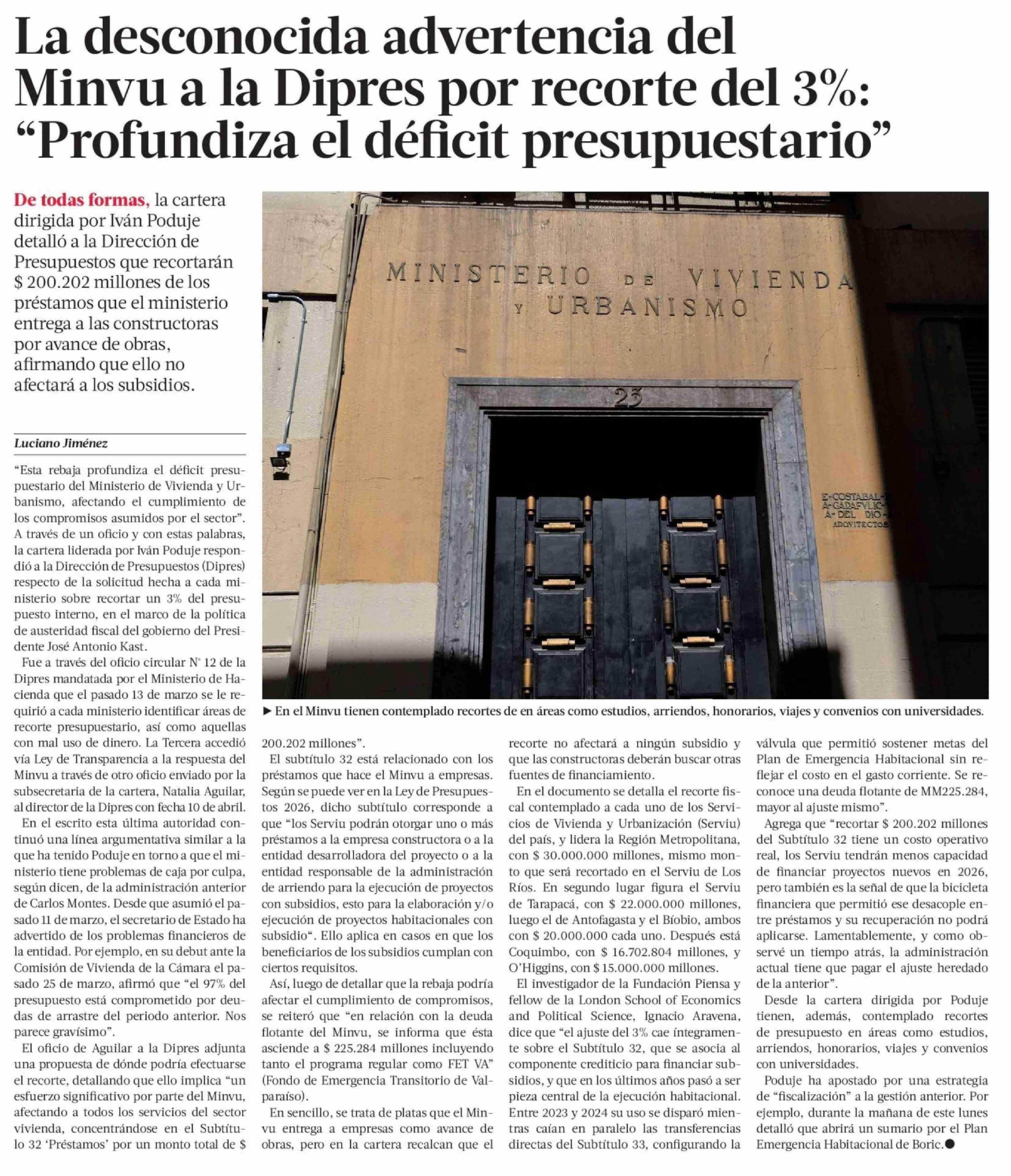 Título: La desconocida advertencia del Minvu a la Dipres por recorte del 3%: "Profundiza el déficit presupuestario"
