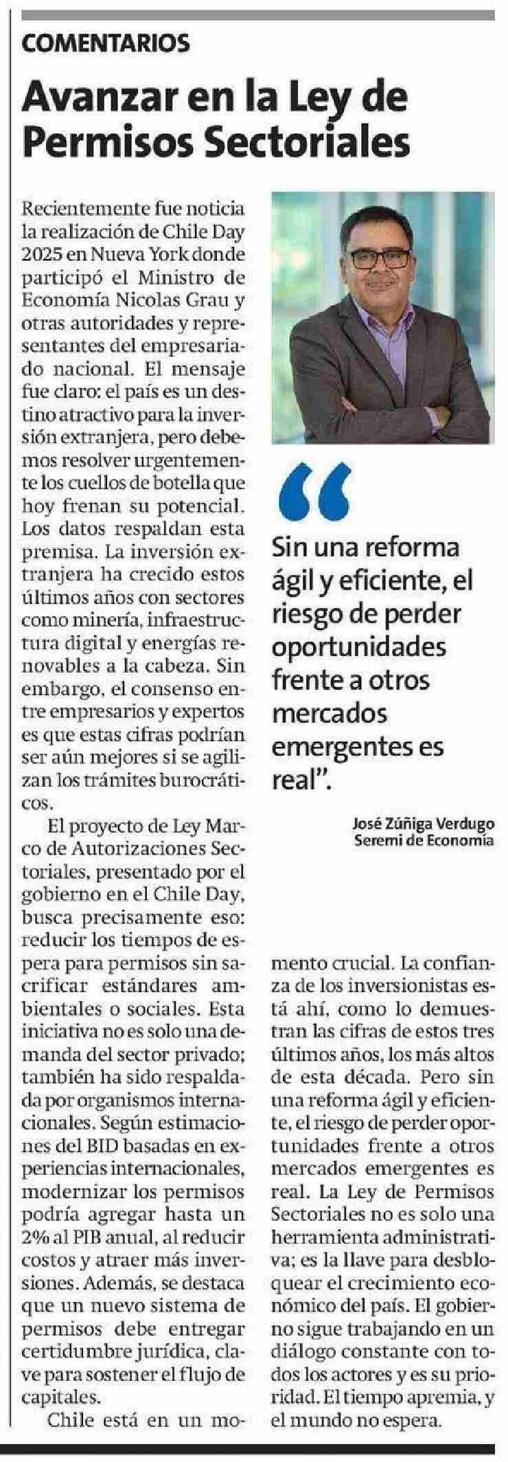 | Título: | Columnas de Opinión: Avanzar en la Ley de Permisos Sectoriales |