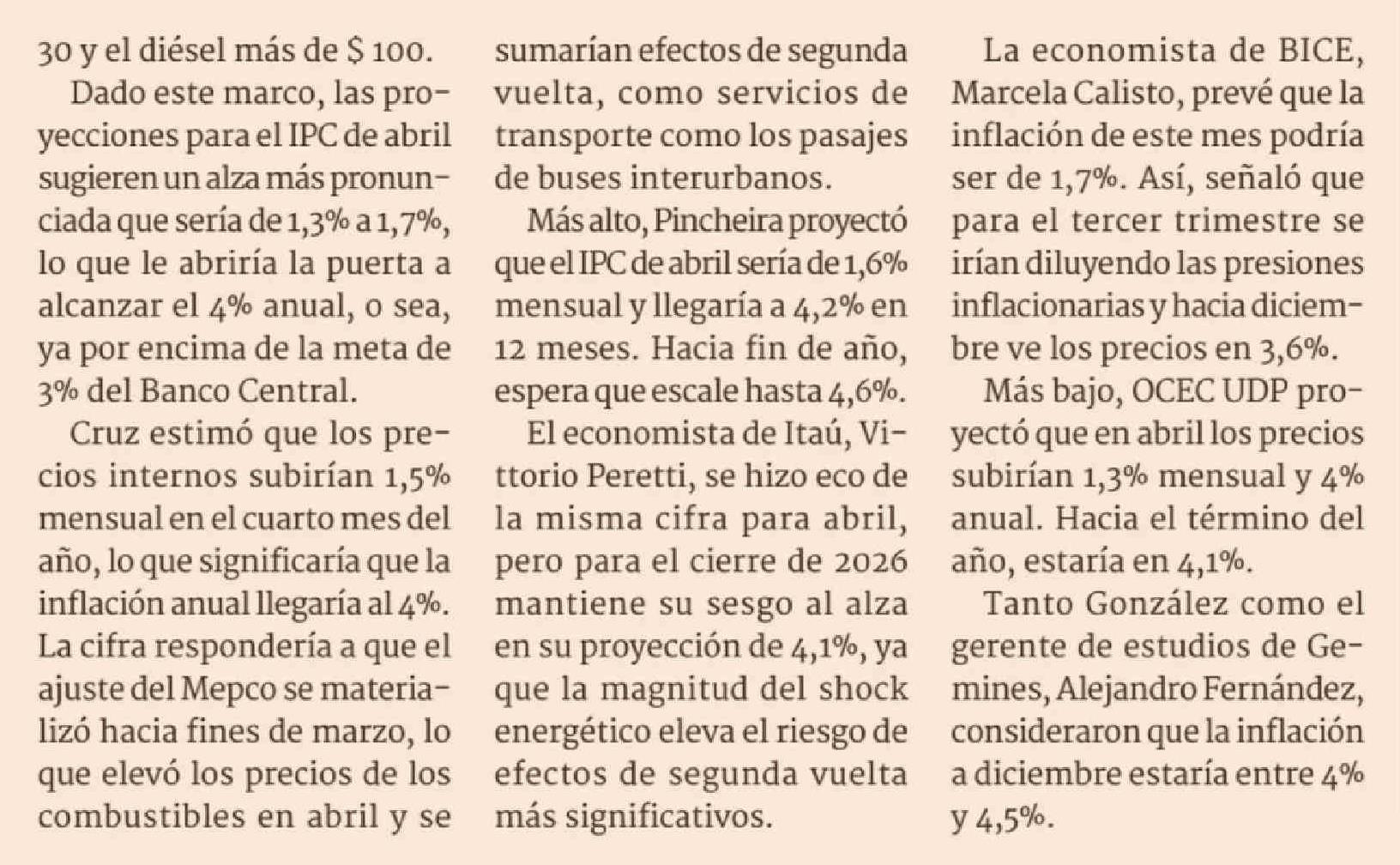 La guerra remece el IPC en marzo, pero abril se llevaría la peor parte y devolvería la inflación sobre 4% 09-04-2026 Diario Financiero |