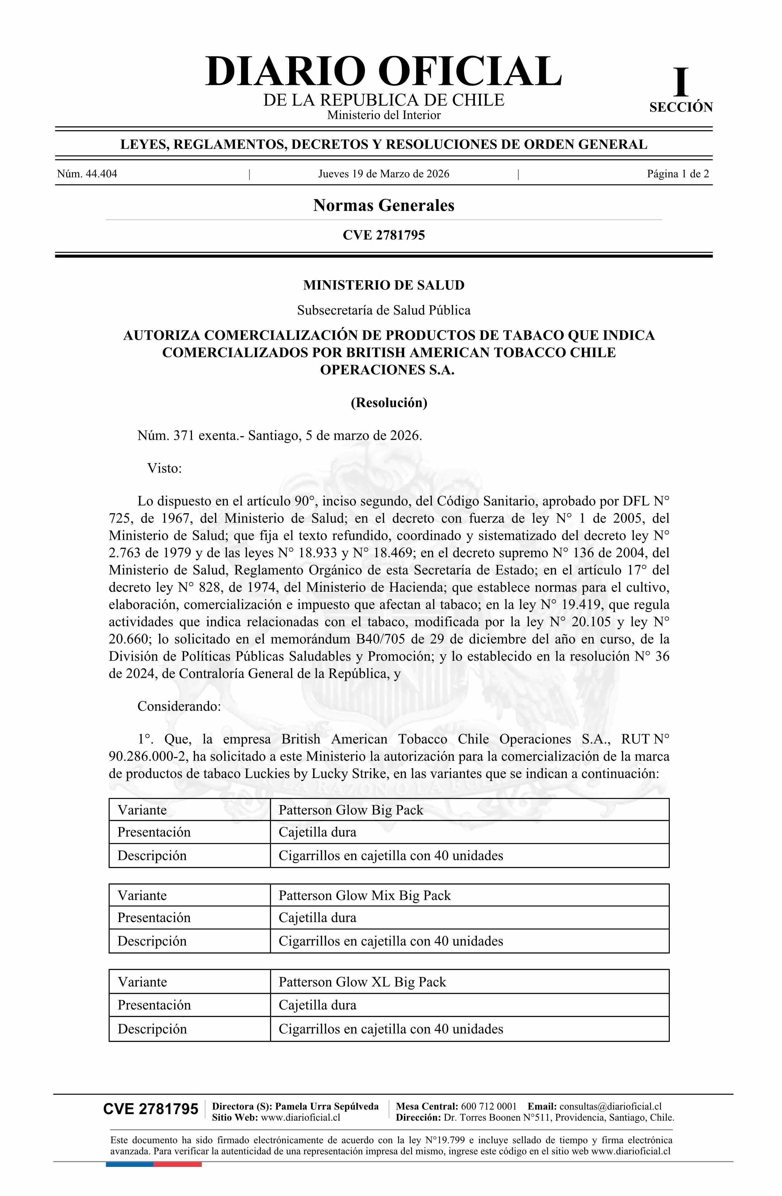 Resolución exenta número 371, de 2026.- Autoriza comercialización de productos de tabaco que indica comercializados por British American Tobacco Chile Operaciones S.A. 19-03-2026 Diario Oficial Edición Electrónica |