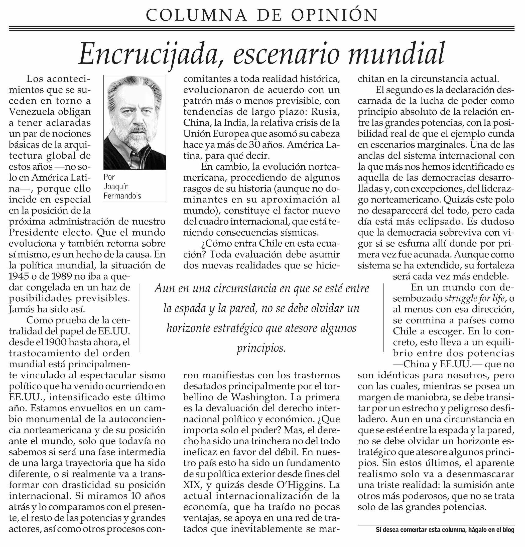 Columnas de Opinión: Encrucijada, escenario mundial 06-01-2026 El Mercurio |