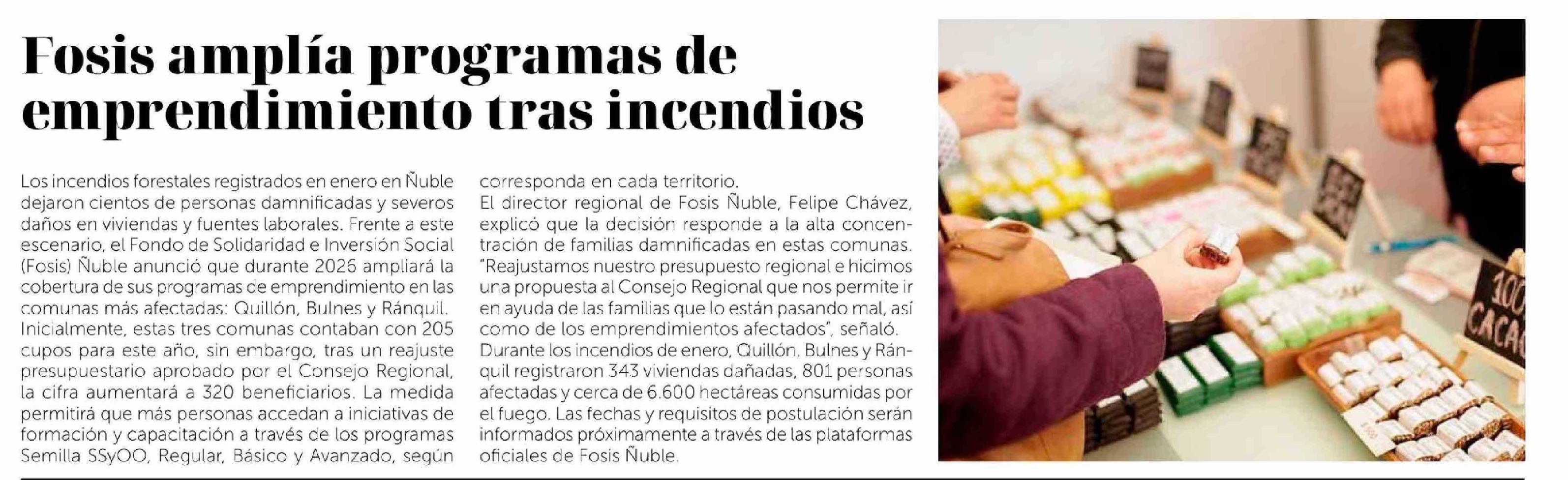 | Título: | Fosis amplía programas de emprendimiento tras incendios |