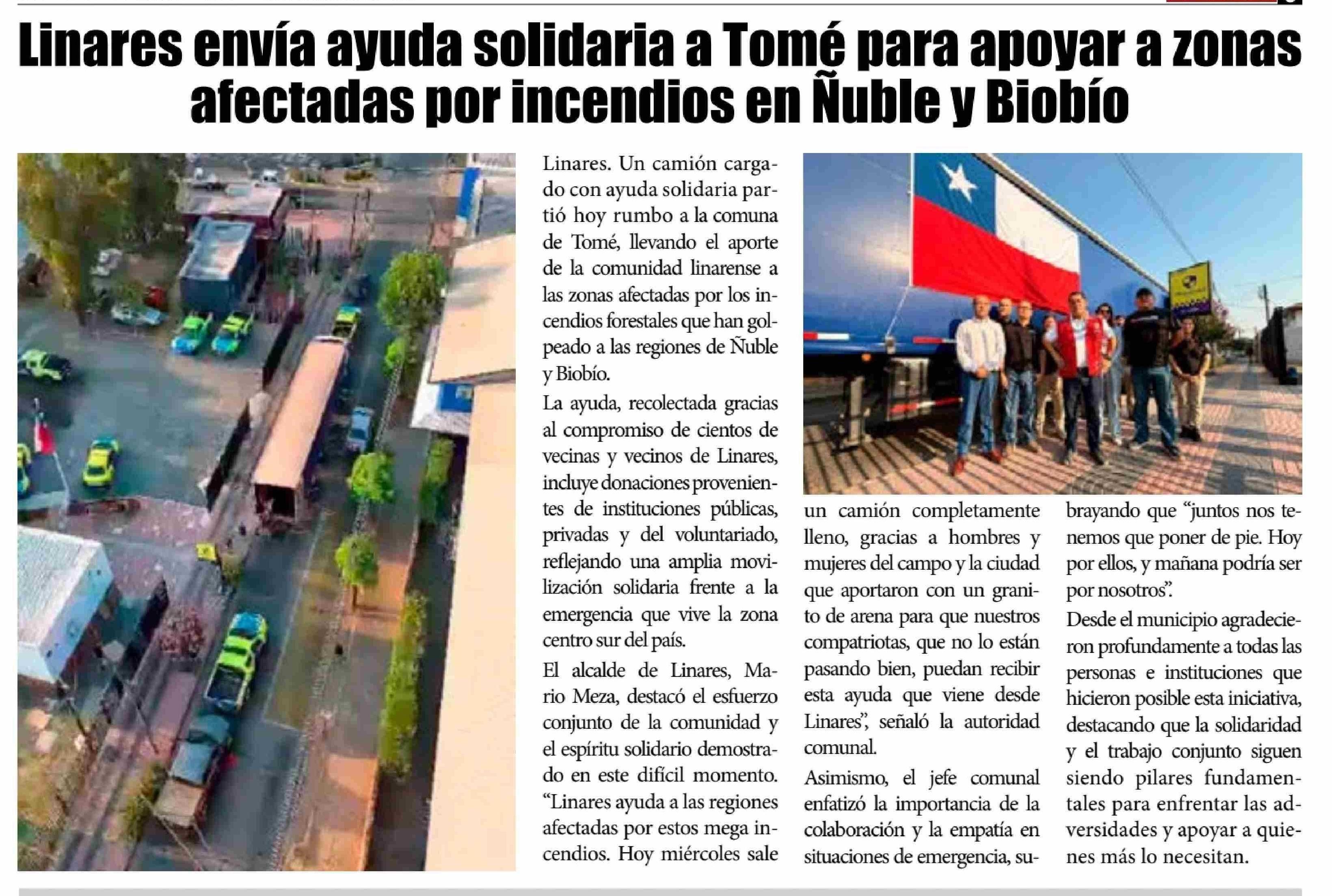 | Título: | Linares envía ayuda solidaria a Tomé para apoyar a zonas afectadas por incendios en Nuble y Biobio |