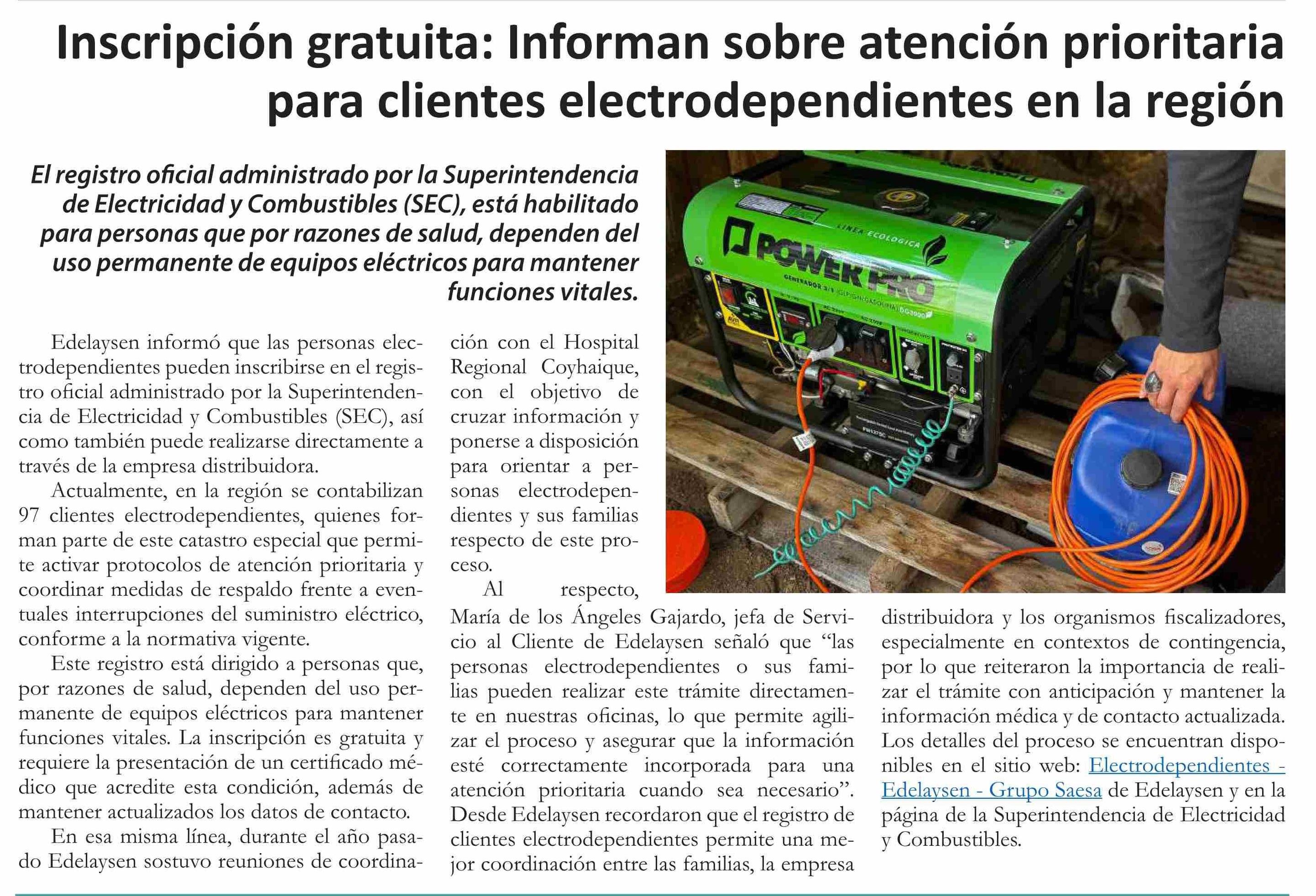 | Título: | Inscripción gratuita: Informan sobre atención prioritaria para clientes electrodependientes en la región |