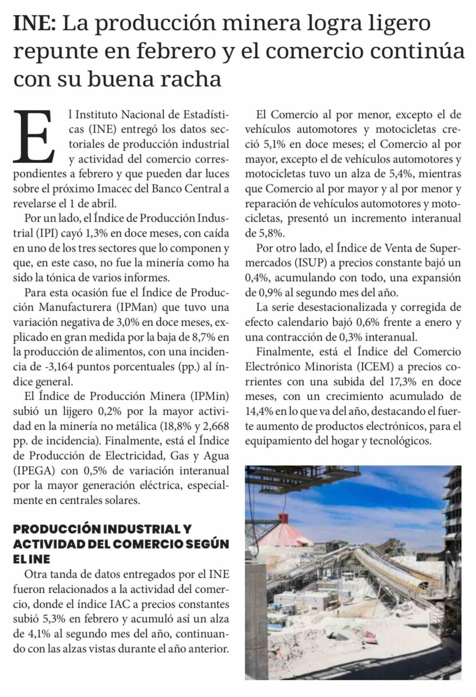 INE: La producción minera logra ligero repunte en febrero y el comercio continúa con su buena racha 01-04-2026 Diario Chañarcillo |