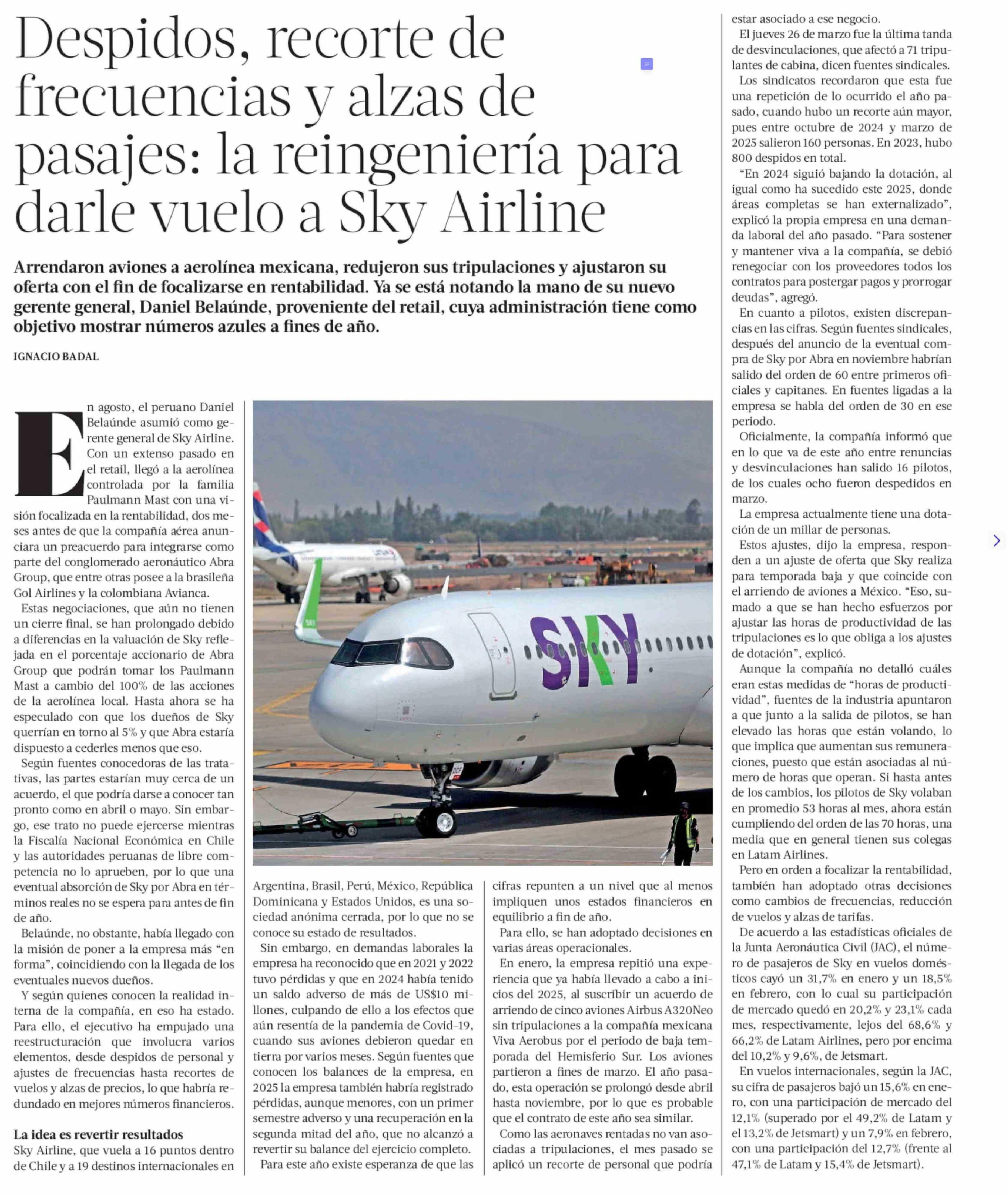 Despidos, recorte de frecuencias y alzas de pasajes: la reingeniería para darle vuelo a Sky Airline 05-04-2026 La Tercera |
