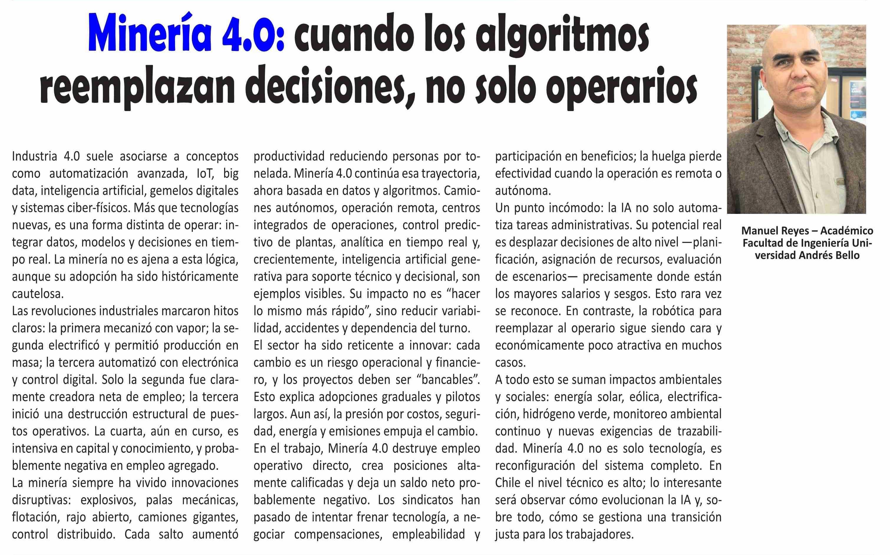 Minería 4.0: cuando los algoritmos reemplazan decisiones, no solo operarios 15-01-2026 El Longino |