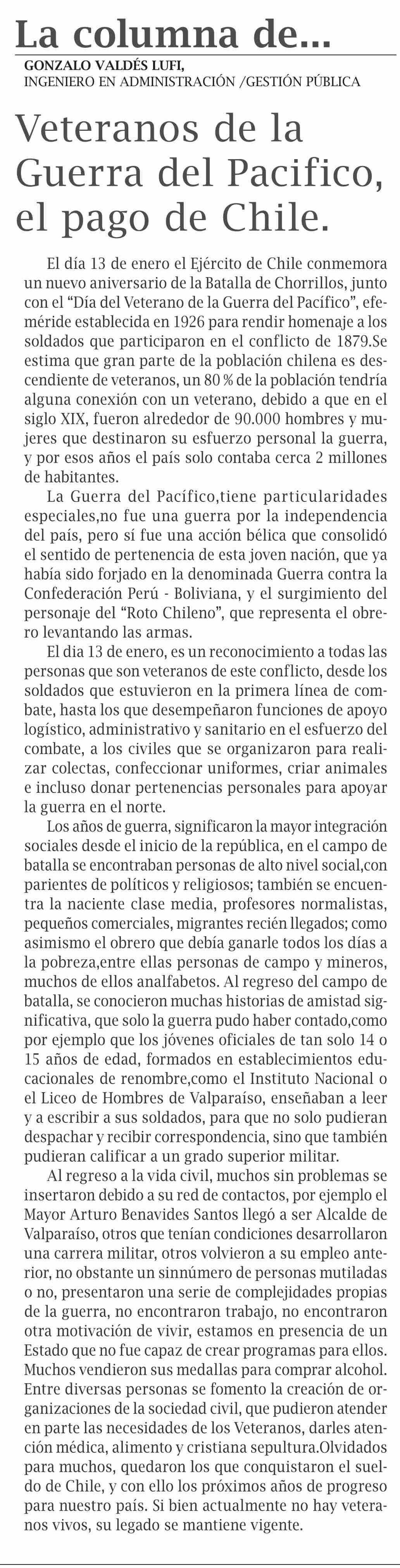 | Título: | Columnas de Opinión: Veteranos de la Guerra del Pacifico, el pago de Chile. |