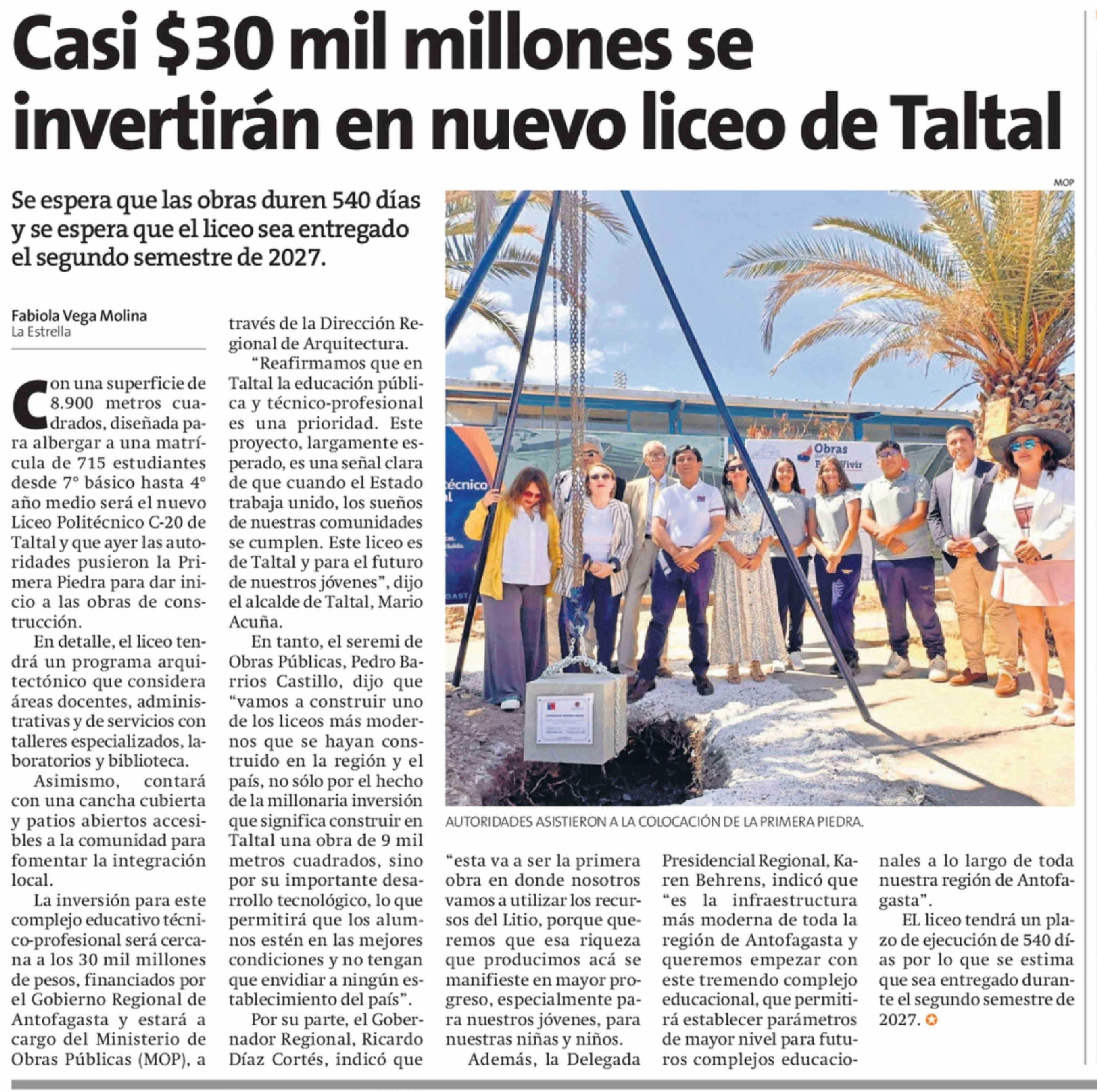 Título: Casi $30 mil millones se invertirán en nuevo liceo de Taltal