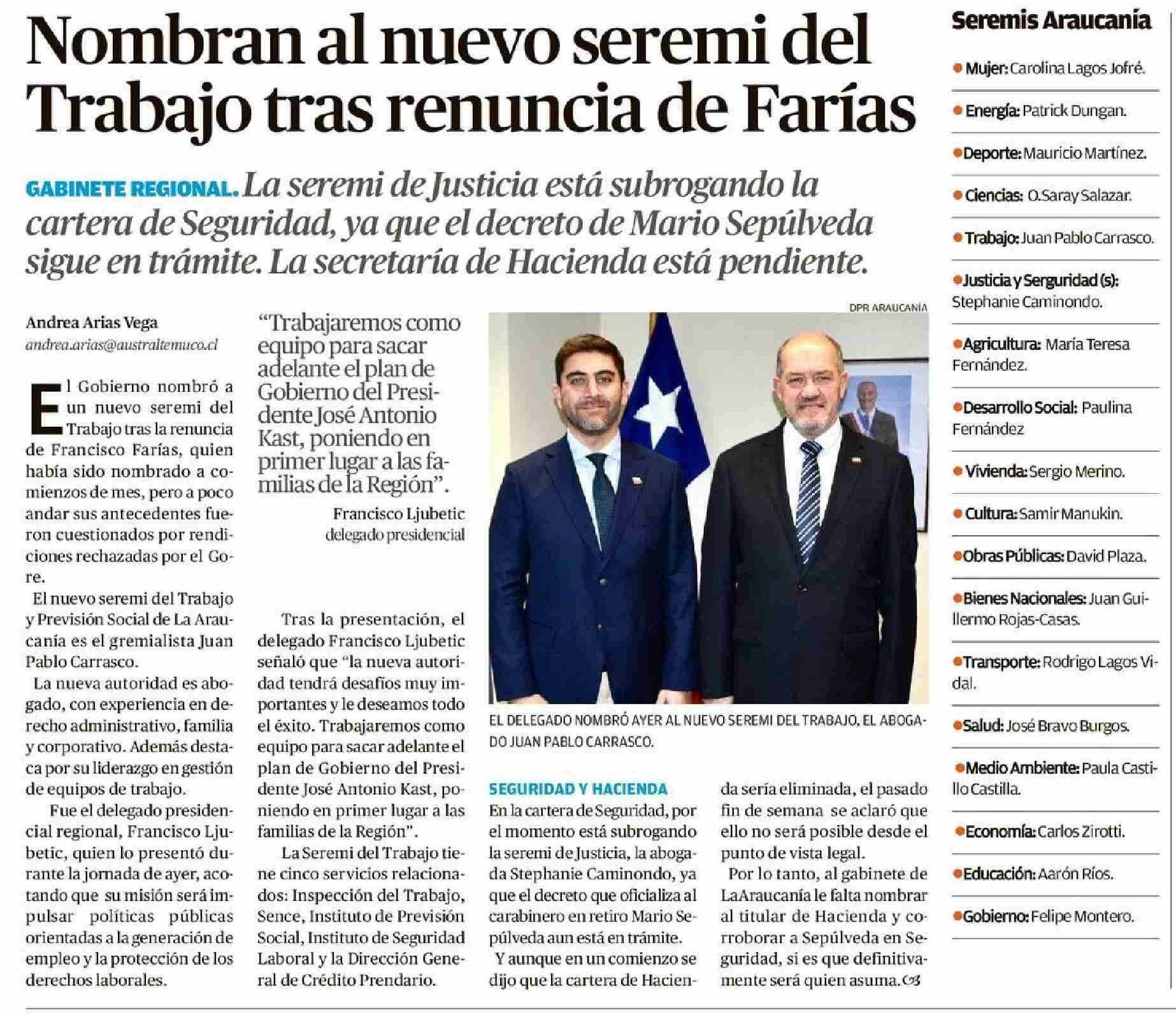 Nombran al nuevo seremi del Trabajo tras renuncia de Farías 15-04-2026 El Austral de la Araucanía |