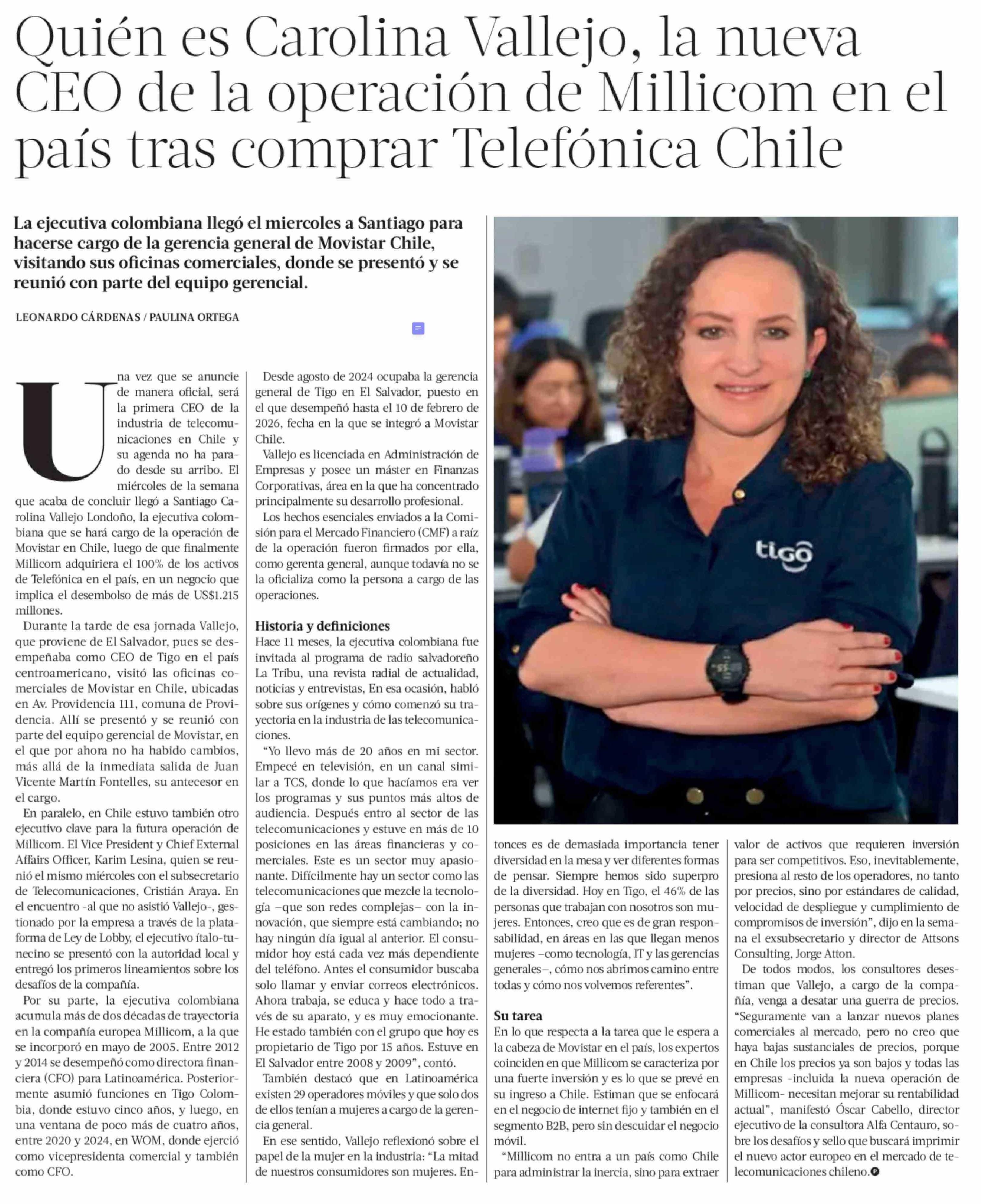 Título: Quién es Carolina Vallejo, la nueva CEO de la operación de Millicom en el país tras comprar Telefónica Chile