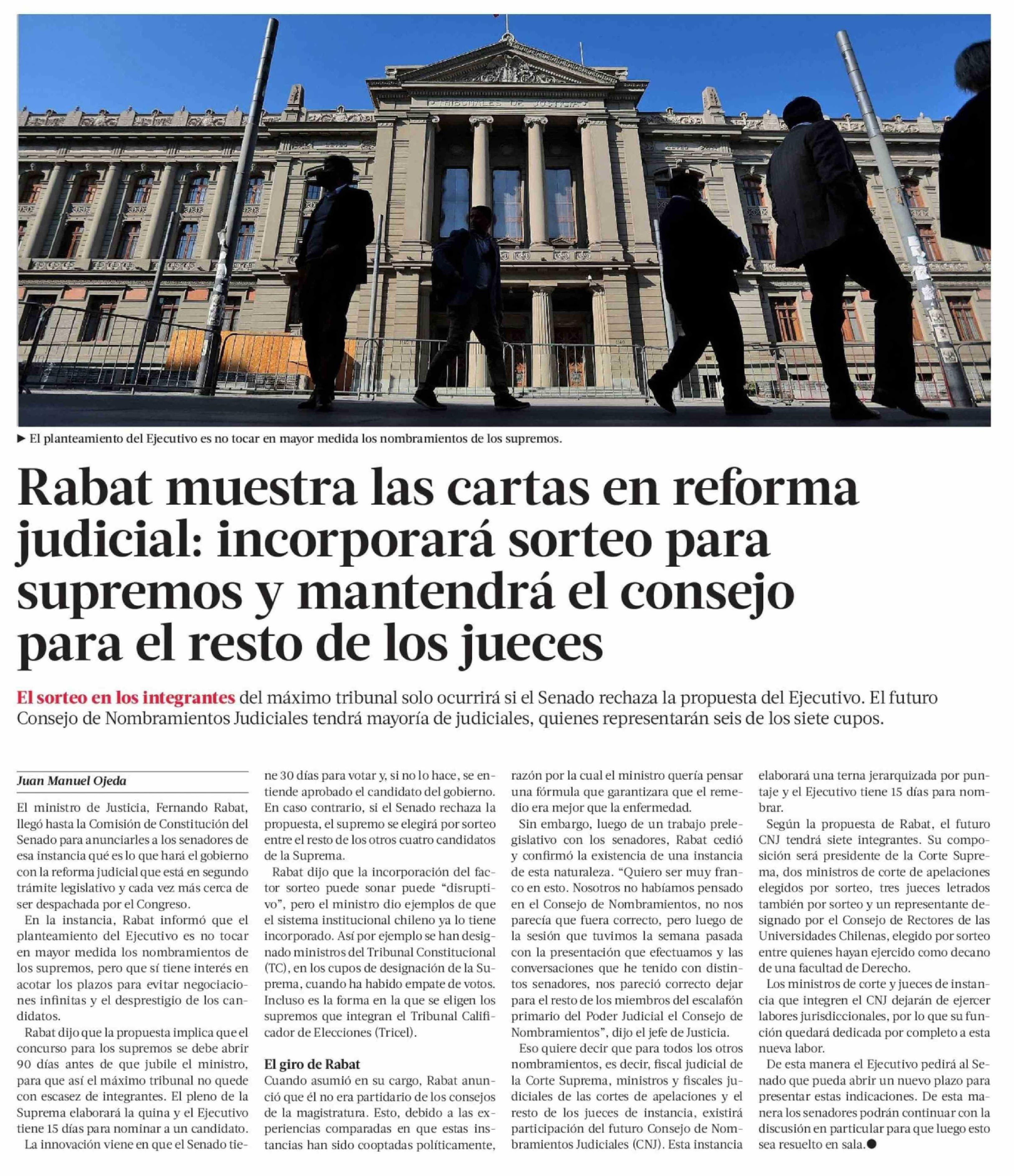 Título: Rabat muestra las cartas en reforma judicial: incorporará sorteo para supremos y mantendrá el consejo para el resto de los jueces