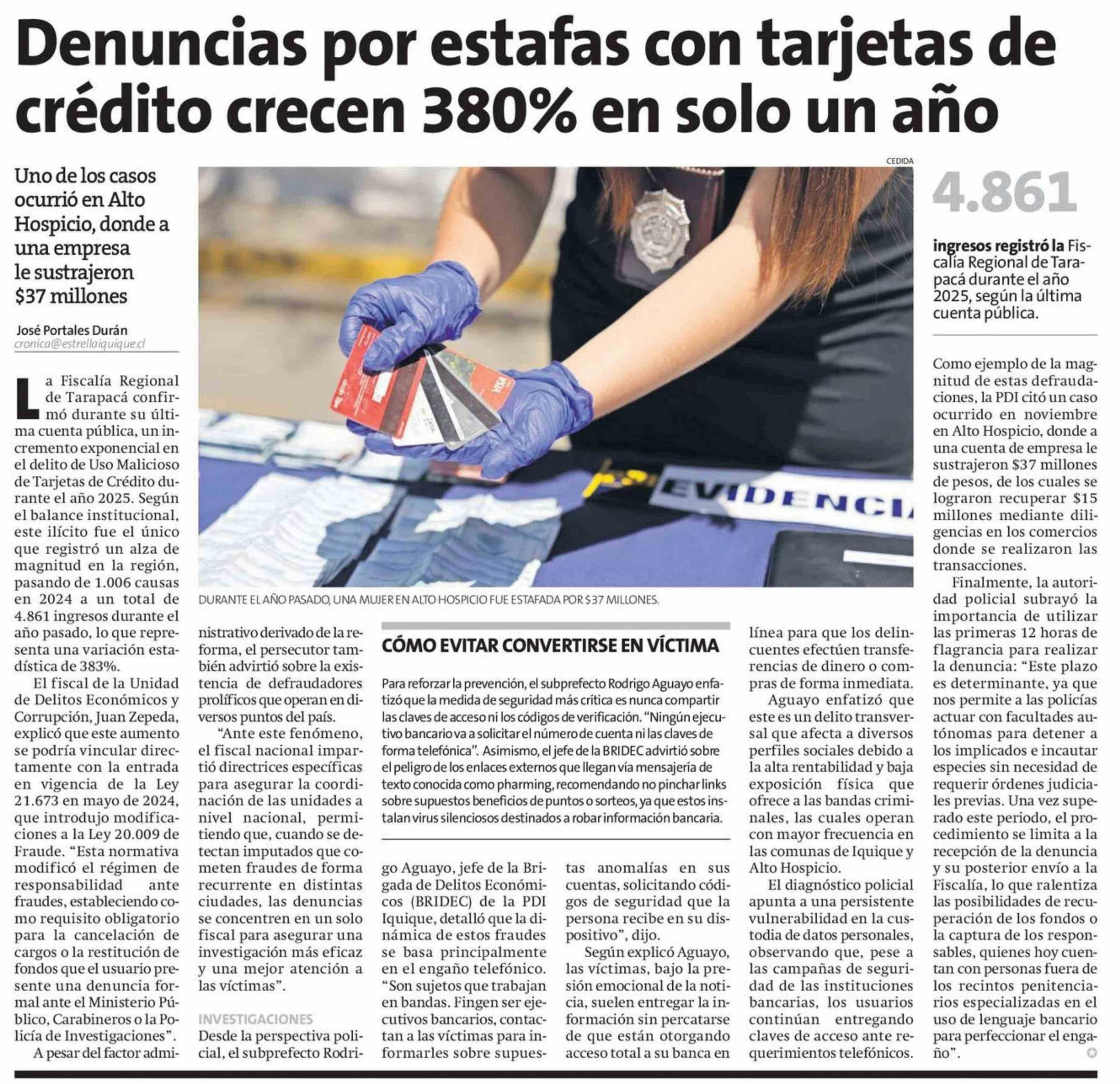 Denuncias por estafas con tarjetas de crédito crecen 380% en solo un año 26-01-2026 La Estrella de Iquique |