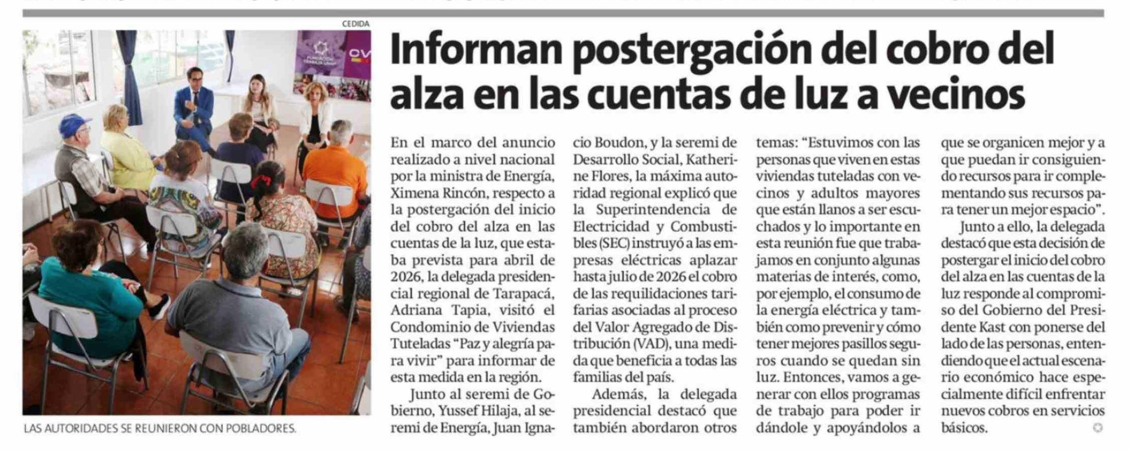 Título: Informan postergación del cobro del alza en las cuentas de luz a vecinos