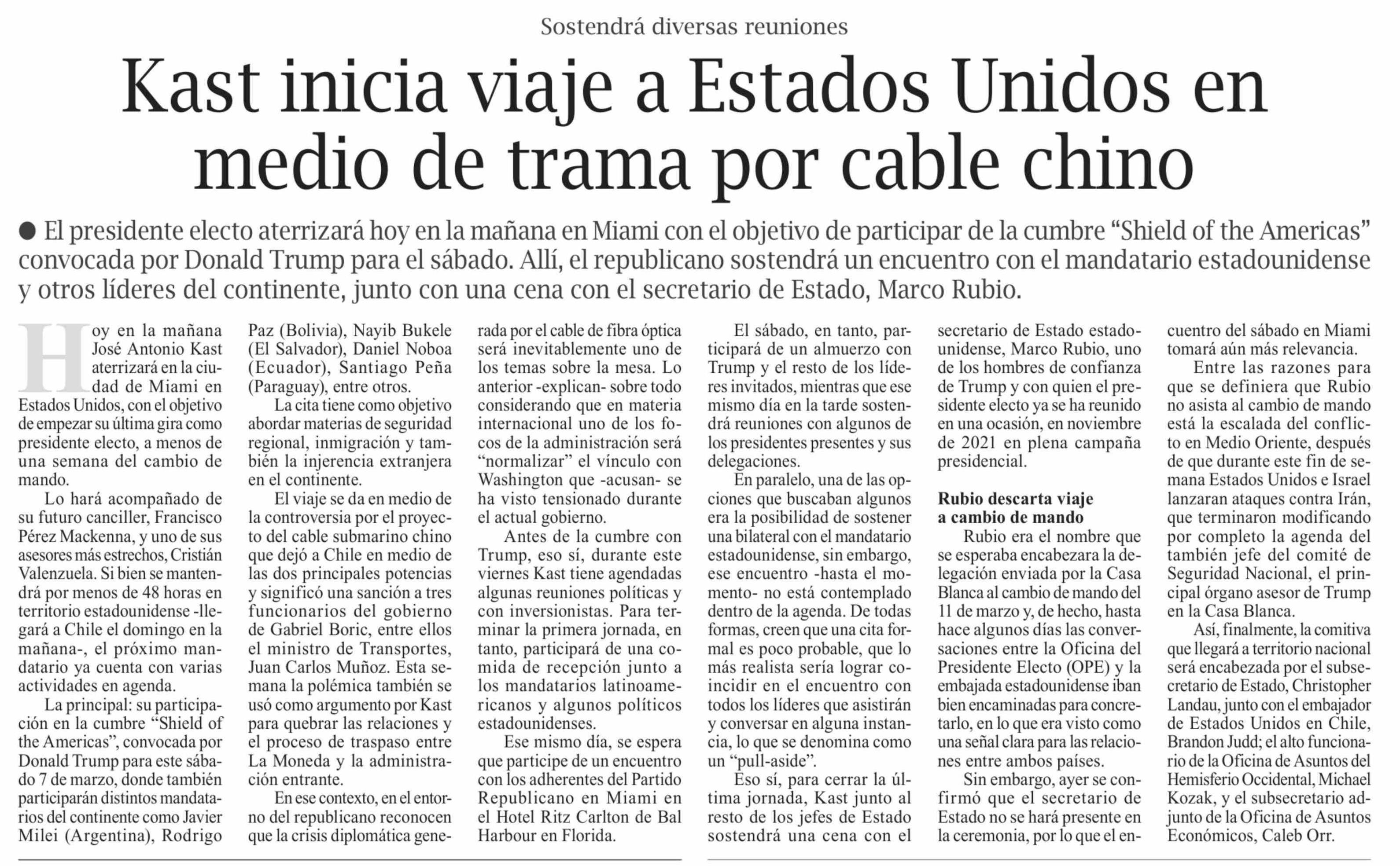 Título: Kast inicia viaje a Estados Unidos en medio de trama por cable chino