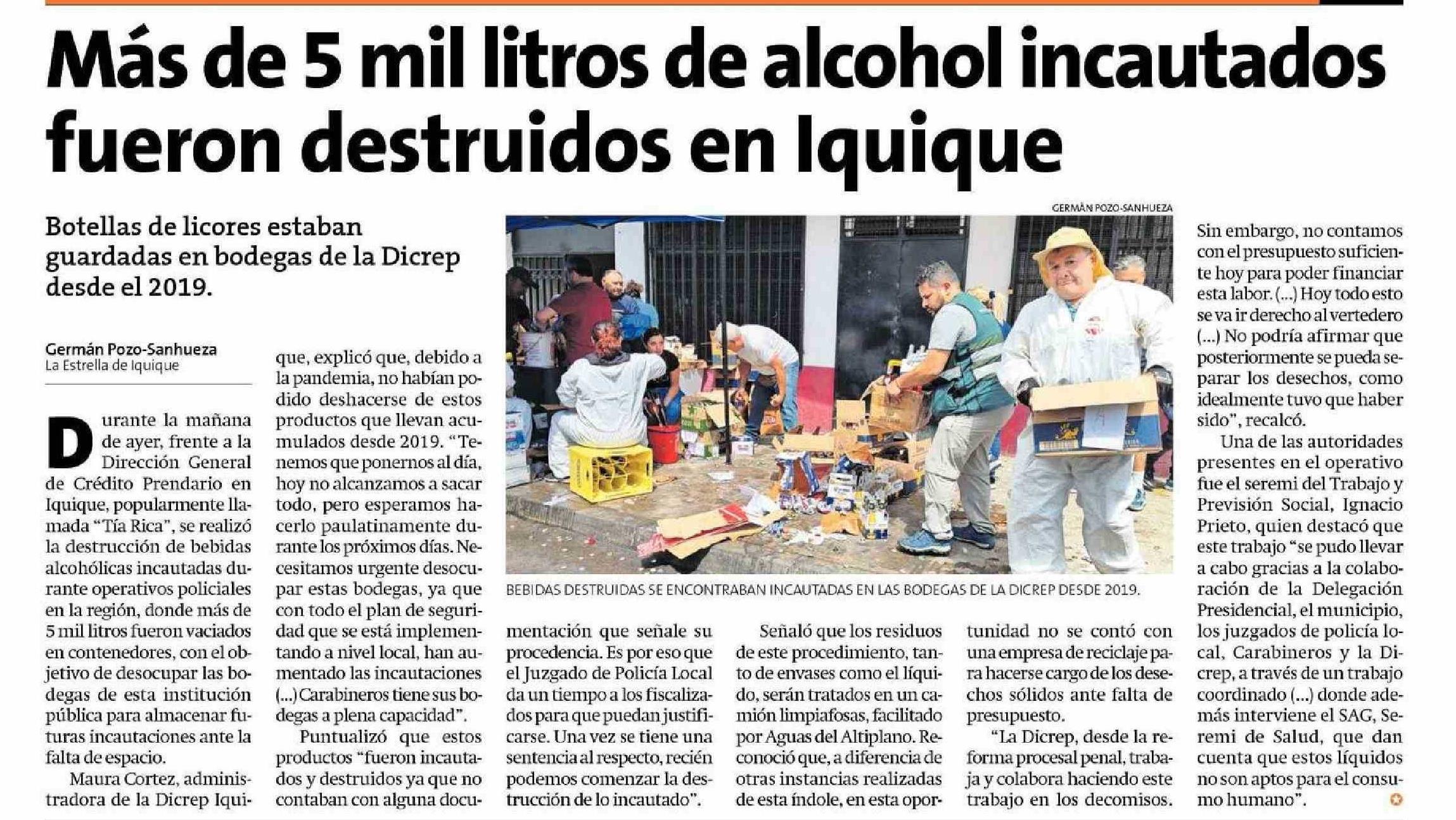 Más de 5 mil litros de alcohol incautados fueron destruidos en Iquique 20-08-2023 La Estrella de Iquique |
